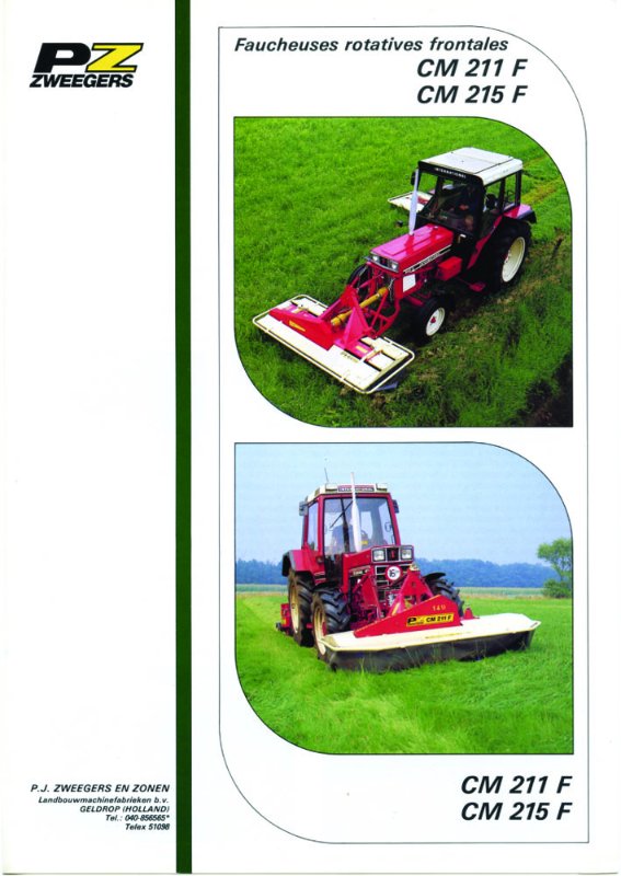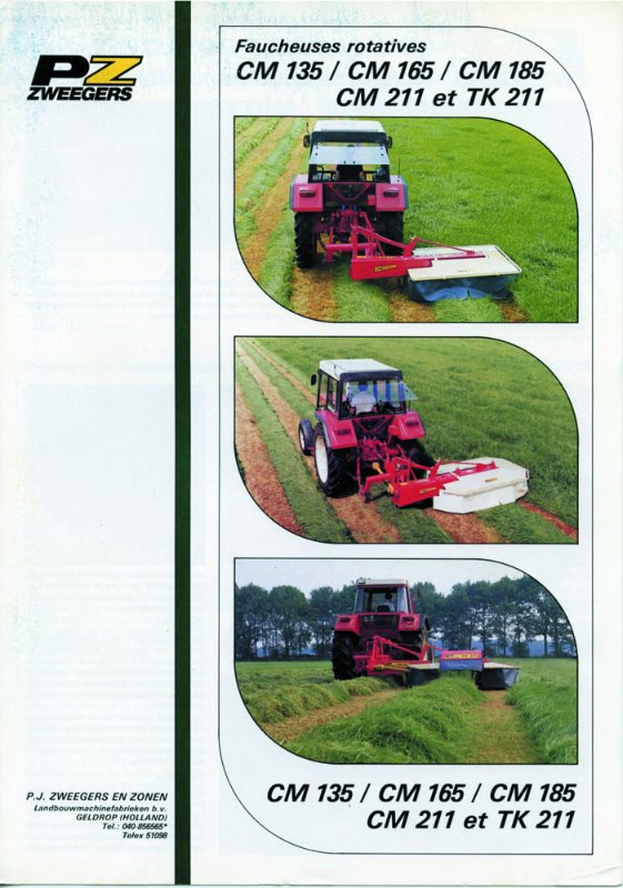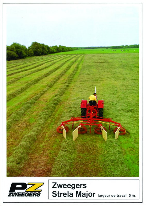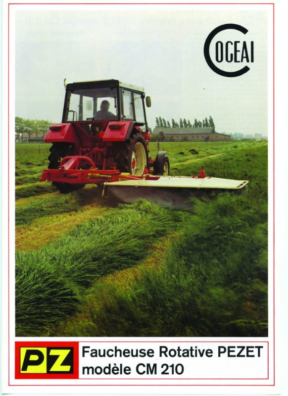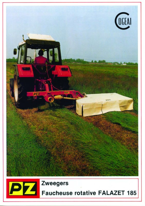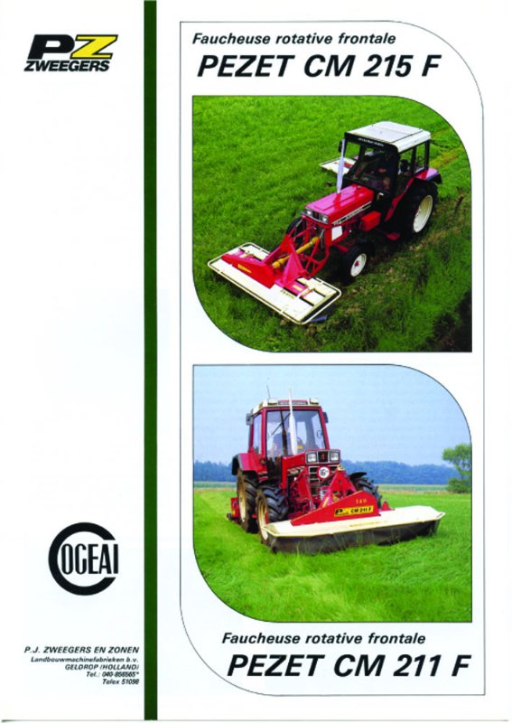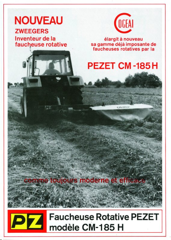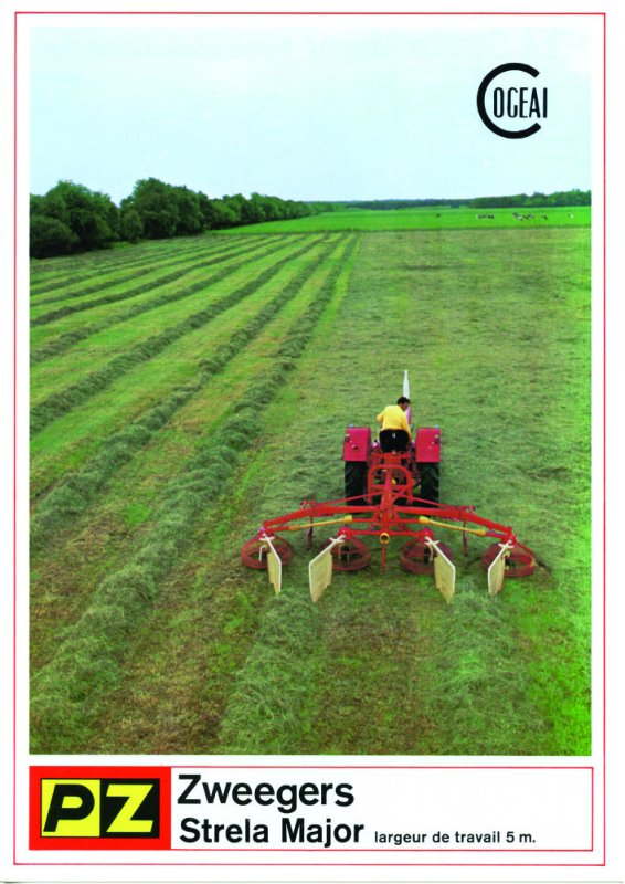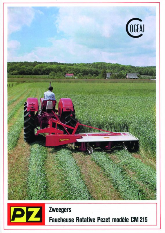 La société Zweegers est apparue en France avec le lancement par la Sté Cogeai de la toute première faucheuse rotative au SIMA de 1965. Ce type de machine a révolutionné la récolte du fourrage et à très vite été copié par la plupart des constructeur (y compris dans sa forme à disques). Aujourd'hui il n'y a pratiquement plus d'autre type de matériel pour couper l'herbe. Avant la PEZET CM4, première machine de ce type commercialisée, un prototype avait vu le jour en 1964, c'est lui qui est à l'origine de toutes les machines actuelles (voir photo). Un autre prototype la CMF220 est né peu après et donnera naissance à toutes les faucheuses frontales. Il ne sera pas commercialisé car trop complexe à adapter au tracteur et l'invention de la prise de force frontale devait simplifier cette adaptation. Elle donnera néanmoins naissance à la gamme CM215.