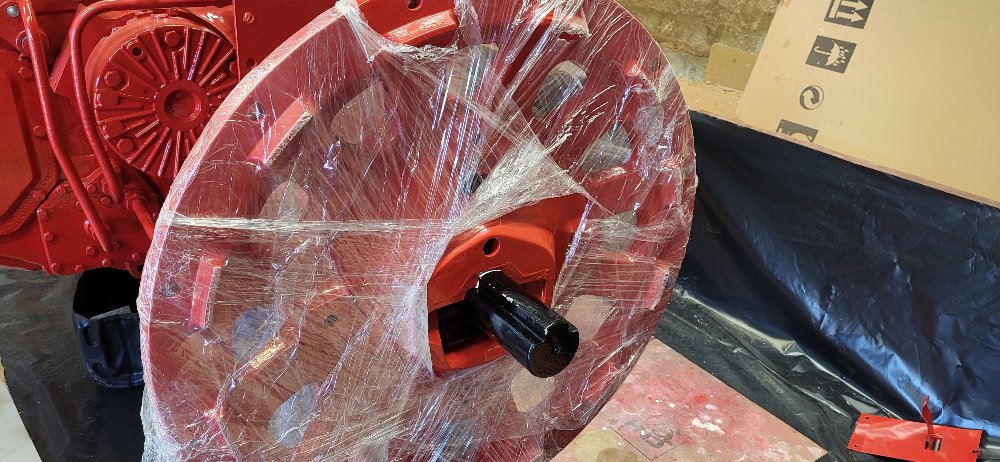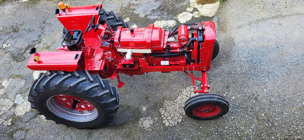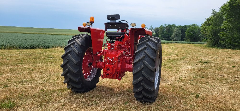 Donc quelques photos de la suite de la restauration... remontage des voiles et roues arrière. Tous les pneus sont neufs. Le tracteur avait des 18.4r38 quand je l'ai reçu et j'ai remis la même dimension au lieu des 16.9r38 d'origine. ça permet d'avoir un tracteur équilibré en hauteur au lieu d'être "assis" sur l'arrière