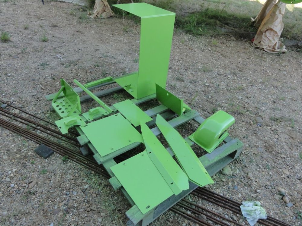 Il reste encore quelques bricoles a finir mais l'été est là et le tracteur sera peint en exterieur par un carrossier local que le projet intéresse... on le met sur cales, démontage de tout ce qu'on peut puis poncage, mastiquage, choix des couleurs le plus fidèle possible... le noir est légèrement satiné, très beau, le + compliqué a été de retrouver le vrai "lime green" et le résultat est vraiment sympa. Les liserés blancs sont peints, c'est pas de l'adhésif.