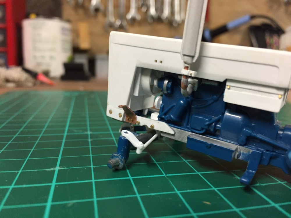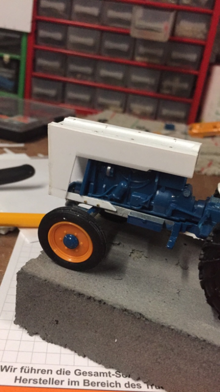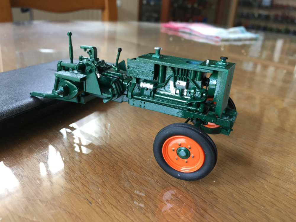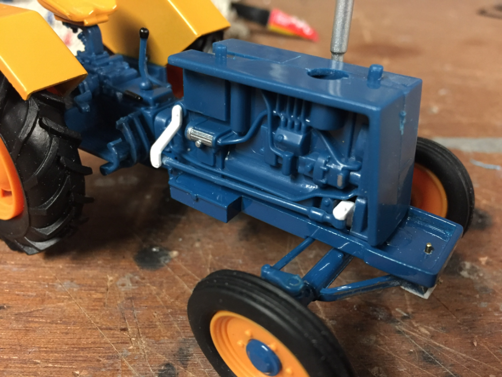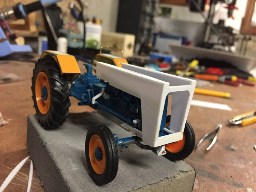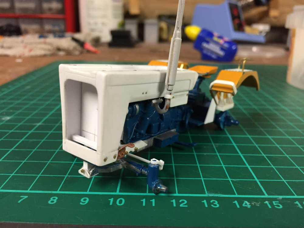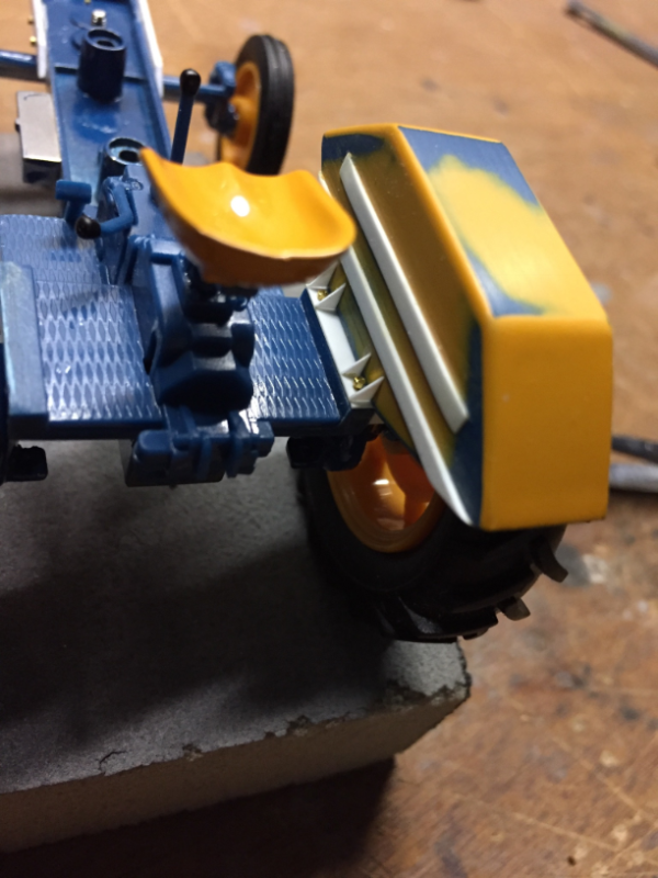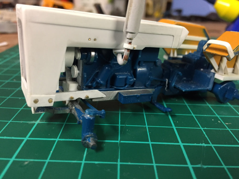 Pour commencé, modification de l'essieu avant et de la direction. Donc passage de la bar de direction coté droit, retournement de l'essieu pour avoir les renfort vers l'avant et découpe du moteur pour faire rentrer le renvois de direction au centre du tracteur