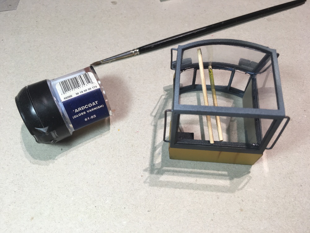 Une fois en place, on s'arme d'un pinceau très fin pour déposer une toute petite goutte de vernis dans les coins. Il faut y aller molo car le risque de voir filer le vernis liquide est élevé par capillarité ...