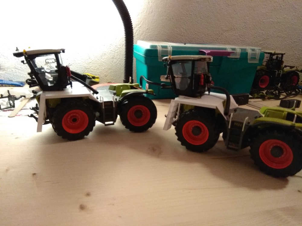 Bonjour a tous! Bon j'arrive longtemps après que beaucoup l'es déjà fait, mais je vous présente ma série de Xerion. Elle se compose de trois Saddle Trac et de trois Trac VC. Pour l'instant ils ne sont pas tous équipés, mais sa viendra au fur et a mesure. Donc dans mon projet Saddle Trac il y a, un avec le Panien PW12A, un avec le solitair 9 et le dernier je suis encore indécis, peut être une cuve. Viens ensuite les Trac VC, un ensemble avec une Samson patiné (fait), un avec la faucheuse Claas (fait) et le dernier avec un solitair 9 avec la trémie sur la partie arrière du tracteur. Je reste a la recherche très active de Xerion, mais ça deviens une denrée rare ces bêtes la, pour continuer à réaliser d'autre ensemble. Place aux photos, qualité téléphone :pff: mais bon :)