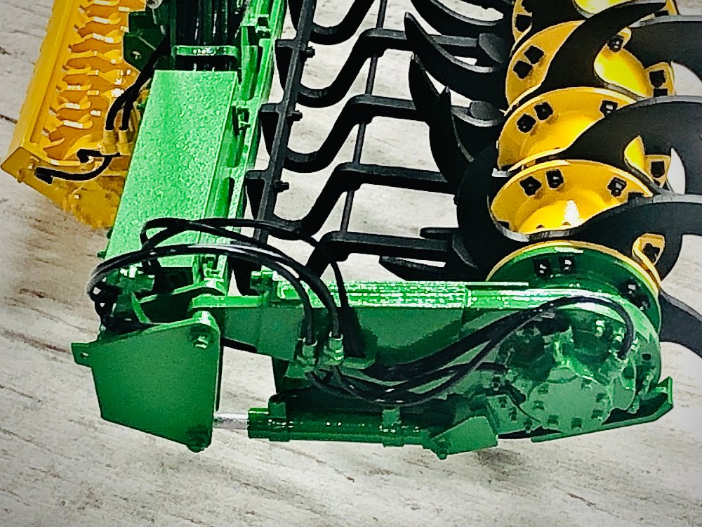 Voici un outil fascinant par son originalité que j'ai entrepris de reproduire au 1/32, c'est la charrue rotative Virès. On la retrouvera devant les Bima 300 et 4400 pour notre plus grand émerveillement. De construction française, médaillée d'or au SIMA 1984, machine signalée en 1985 puis présentée en association sur un Bima 300 en 1988, elle a pu être adaptée sur de gros porteurs comme les Bima en entrainement hydraulique mais aussi sur le Steyr 8320 en transmission mécanique à courroies. Quelques rares versions traînées verront également le jour.