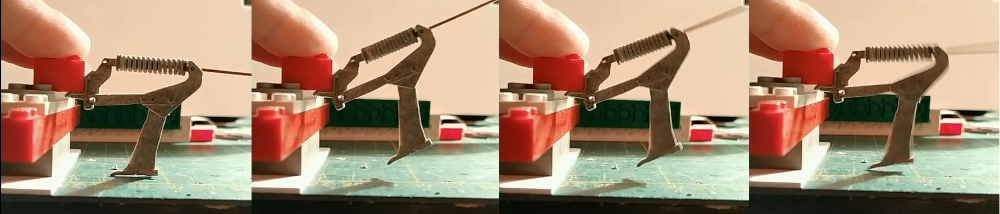 Suite à ce test, j'ai fait quelques petites modifications sur la CAO de la dent et surtout du ressort. J'ai réduit légérement le diamètre du fil (0.8 à 0.7mm), et retiré 2 spires sur la longeur à vide afin d'augmenter le débattement qui est assez faible ici. Mais l'idée est la, le résultat est concluant.