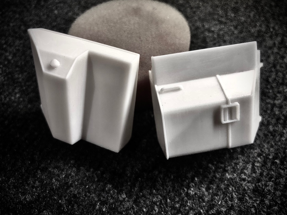 On retrouve donc la future console de commandes avec des boutons de 0.2mm🧐 pour se faire une idée de la taille des détails. Le volant est bien sorti aussi. Enfin un petit essai est lancé pour des extincteurs de cabine.