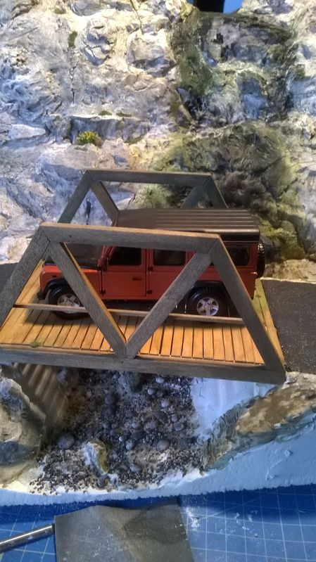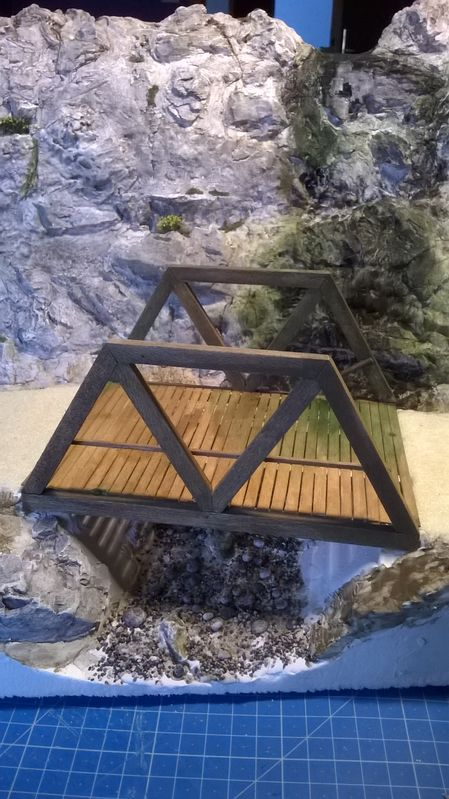 Lorsque j'ai commencé le projet, je pensais réaliser un pont en béton avec un parapet en pierres, mais je n'étais pas sur du résultat que cela donnerait. Je me suis souvenu que j'étais passé sur plusieurs ponts en bois lors de mes excursions sur les petites routes de la campagne norvégienne. J'ai alors décidé d'en réaliser un qui combinait plusieurs modèles que j'avais pu voir. Après quelques minutes à récupérer quelques dimensions sur le diorama, je fais rapidement une 3d pour avoir les différents angles des pièces et je passe sur ma petite scie circulaire Proxon. En 2 temps 3 mouvement j'ai toutes mes pièces et je peux commencer à assembler. J'ai renforcer toutes les parties critiques du cadre avec des clous de tapissier qui rentrent très facilement dans le balsa que j'ai utilisé.