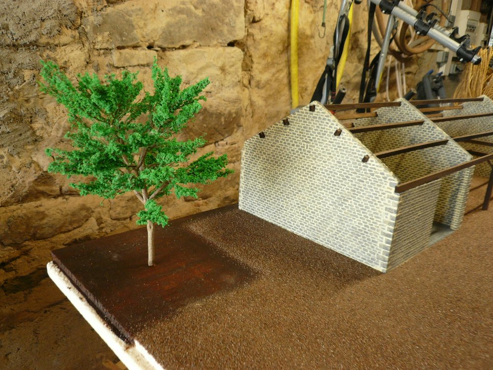 Oui Bernard, la haie est faite avec des branches de thym et du flocage comme pour l' arbre. j'enfonce les branches une à une dans le support (polystyrène) . Le support blanc est juste la pour l'essai. je les replanterai une à une après quand je ferai l'extension de la cour devant le bâtiment.