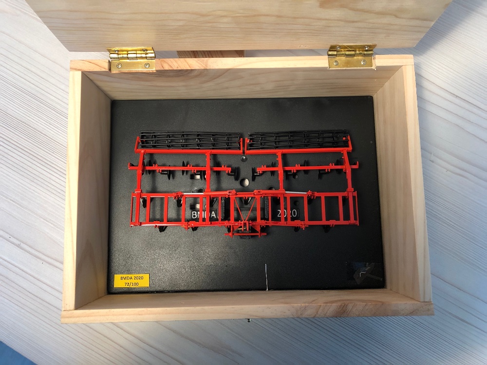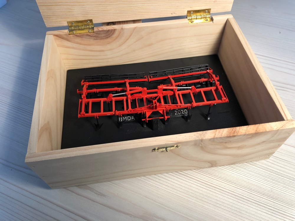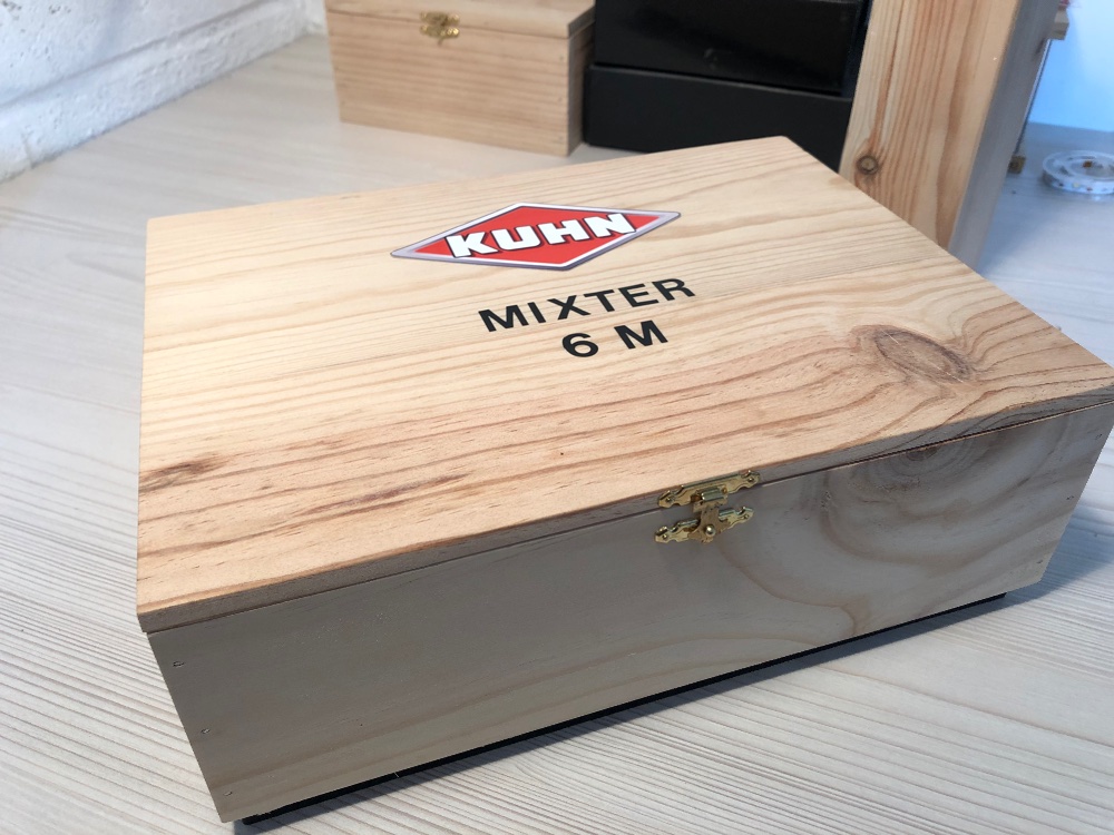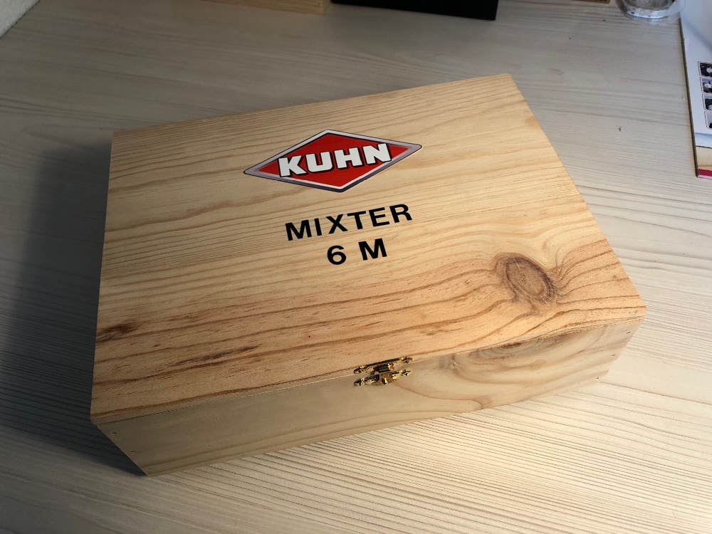 Aujourd’hui, je vous présente la boîte réalisée pour protéger le modèle BMDA 2020, le Kuhn Mixter qui a été vendu sur un socle. Pour se déplacer à une expo, l’empiler ou le ranger se fait plus simplement dans une boîte.