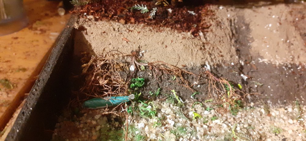 #3après avoir installer les berges par dessus le terreaux et les arbres, j'ai créé le lit de la rivière avec du petit gravier d'aquarium, ensuite, j'ai taillé les passages de roues