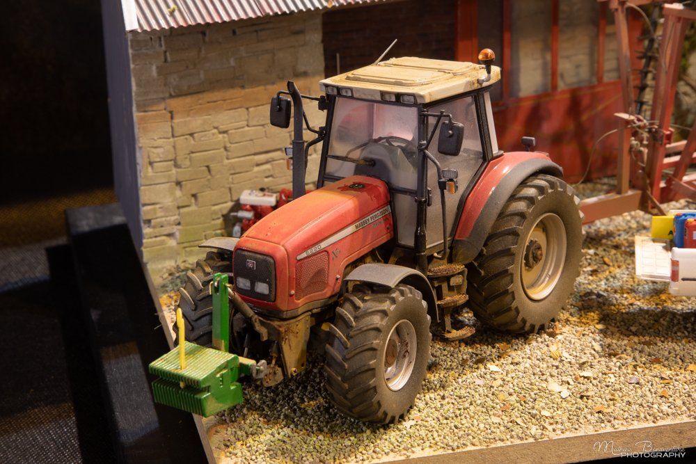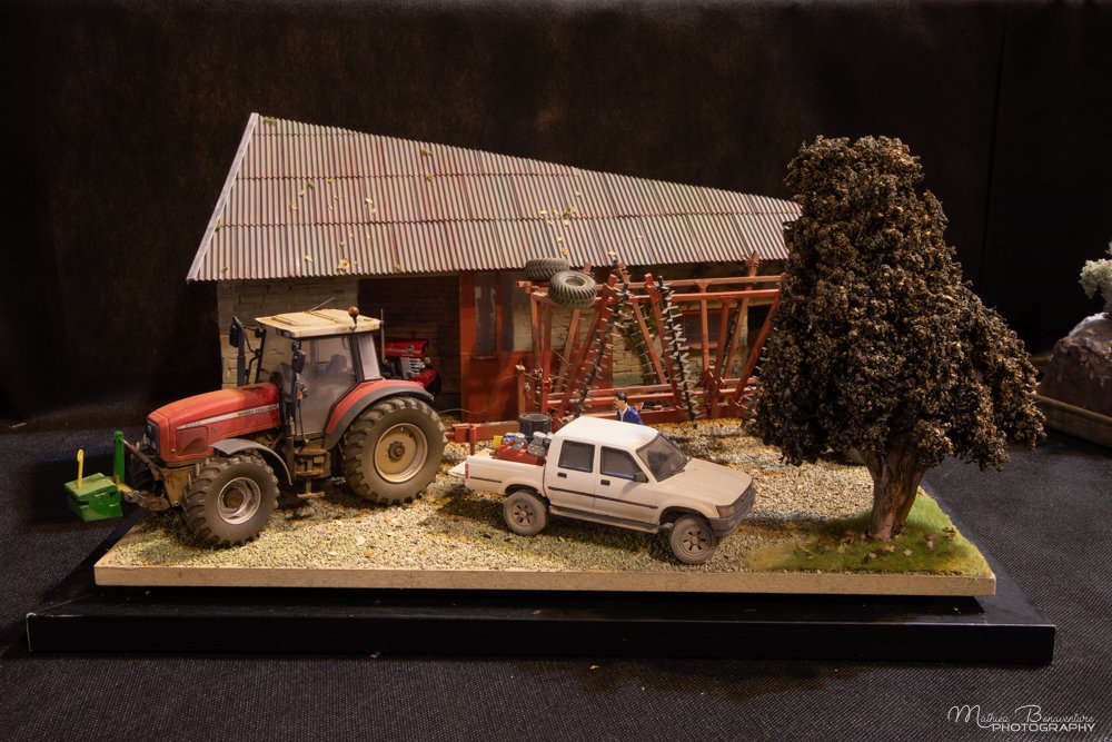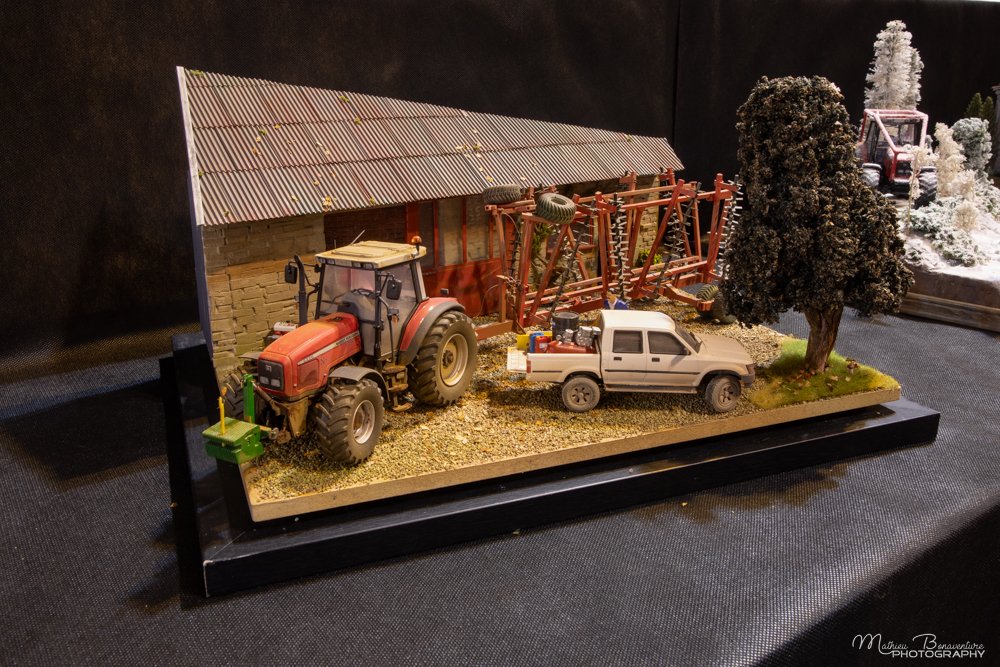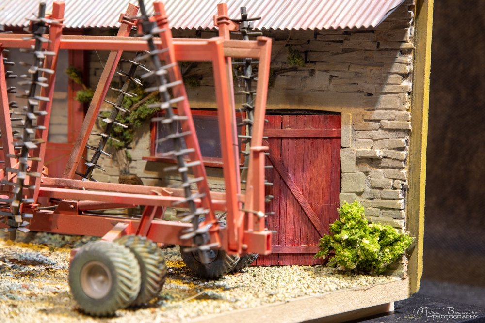 Mon diorama est inspiré d'une ferme typique de Haute Marne (mais qui pourrait trouver aussi quelques similitudes avec le Soissonnais et la Côte d'Or). Le tracteur, ce Massey Ferguson 8220 est déjà très détaillé et, à mon goût se suffit à lui-même. Non pas que je me complaise à le laisser dans son état sortie de boîte, mais je me voyais mal le transformer comme je l'ai fait avec le Ford TW. Il faut dire qu'il est plus récent, et donc n'évoquait pas autant d'histoires que de précédents modèles. Il fallait aussi tenir compte des dimensions assez limitées du diorama (30x40 cm). C'est un gros tracteur. L'associer à un outil correctement dimensionné est particulièrement complexe. Par chance, il tient sur le diorama prévu avec ses bêches roulantes, un outil artisanal déjà présenté car réalisé pour une exposition en Bretagne il y a un moment.