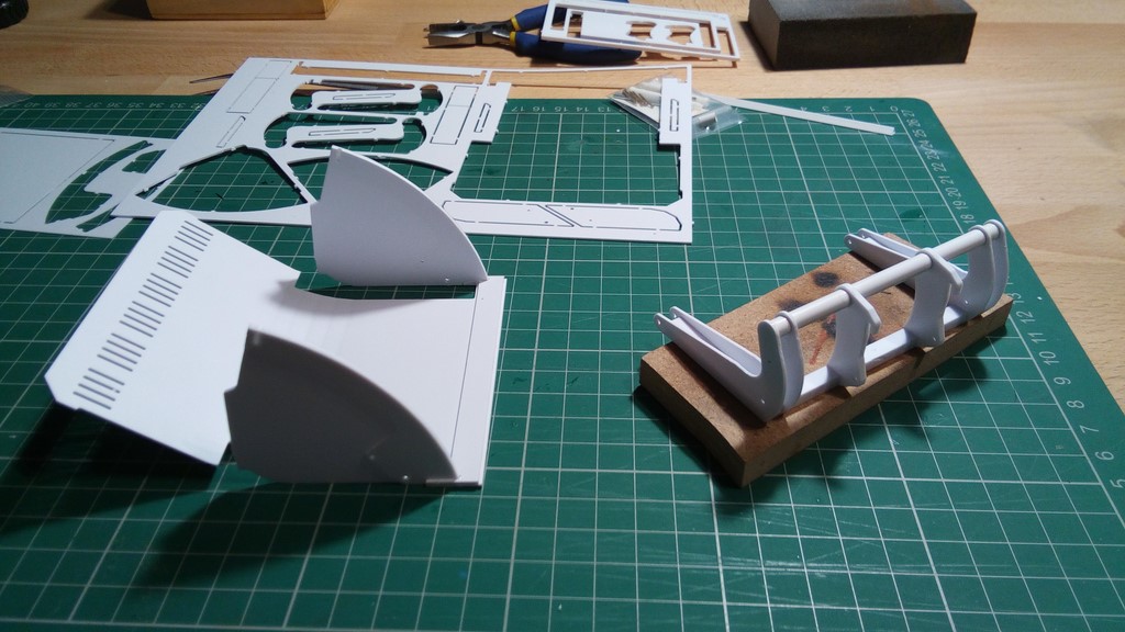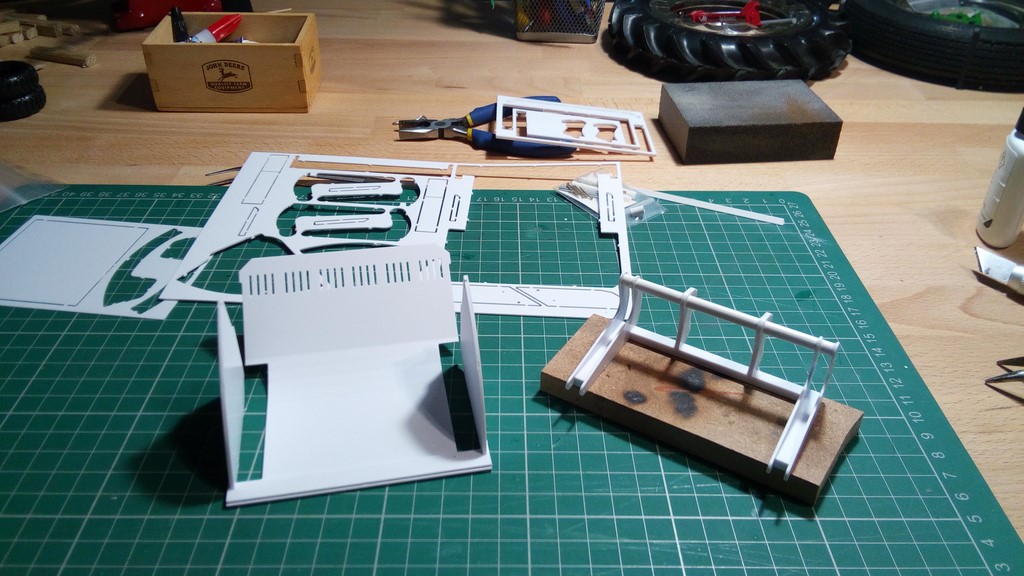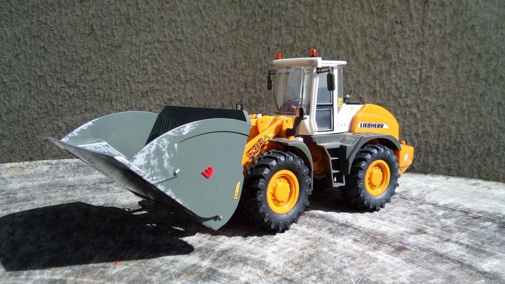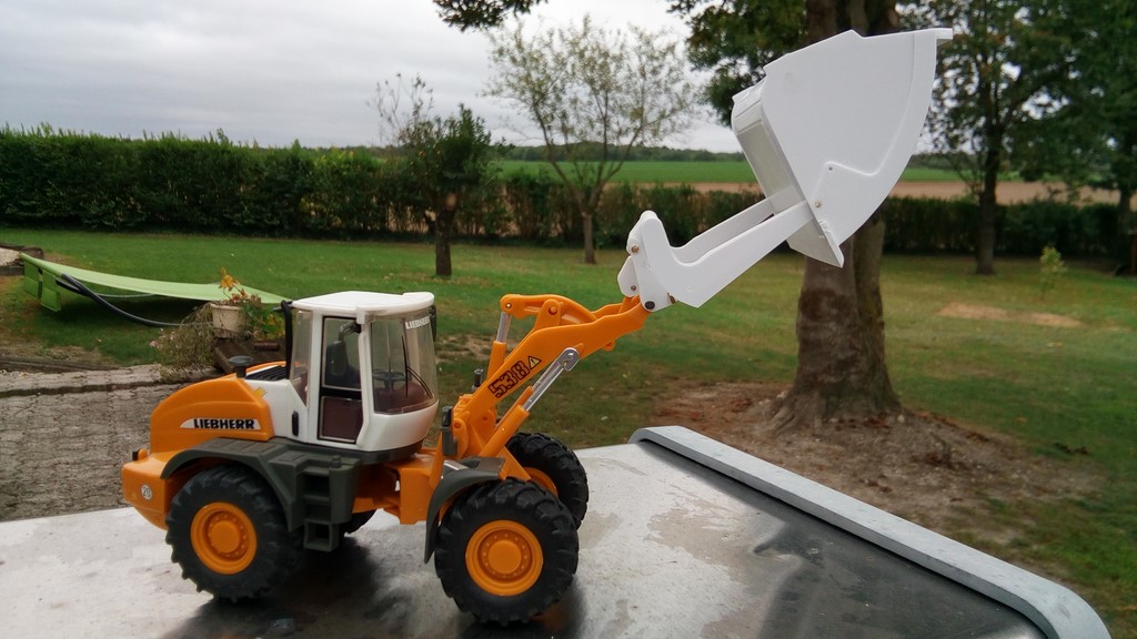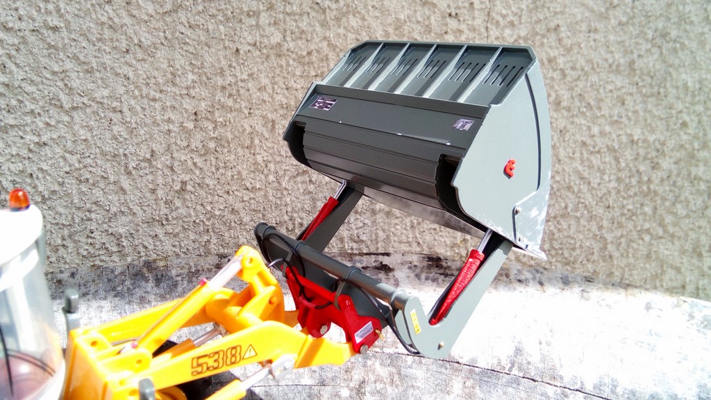 retour sur le montage le mois dernier d'un godet hydraulique farmmodels en kit avec fabrication d'une interface pour adaptation sur un chargeur Liebherr 538