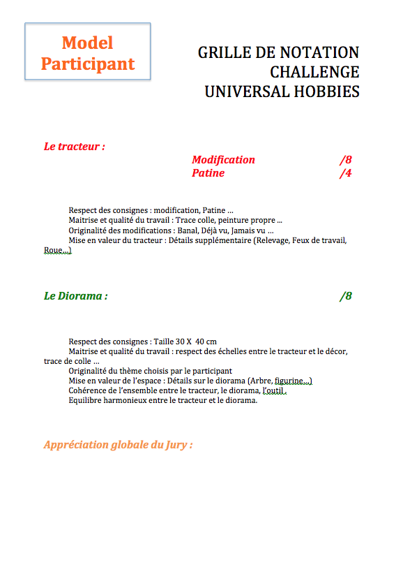 N'oubliez pas que le Challenge porte essentiellement sur le tracteur (CF: voir grille de notation)