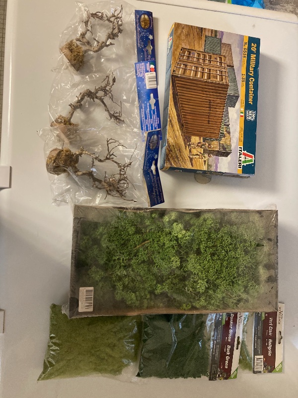 Lot de végétation pour diorama ( flocage et arbres ) et contenaire en kit 40€