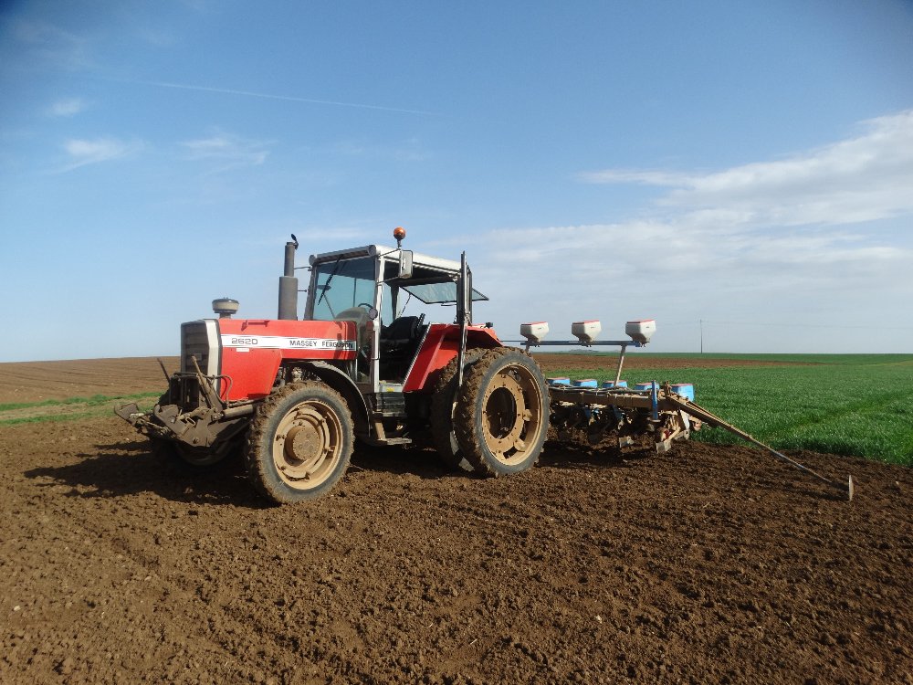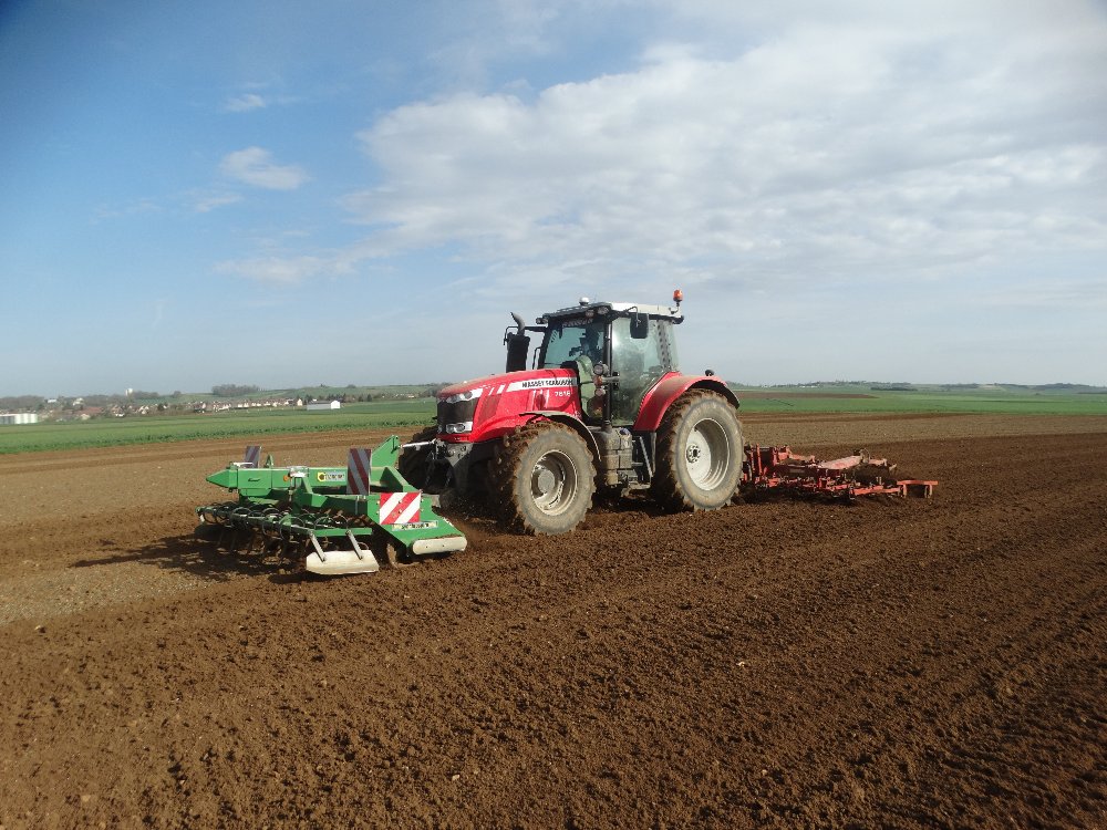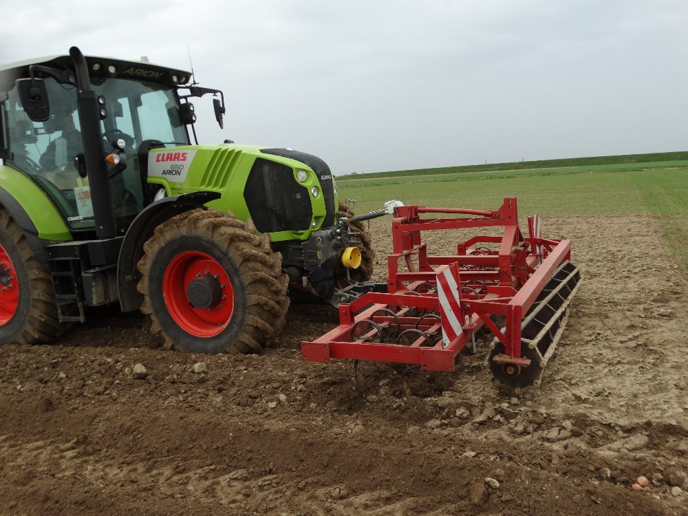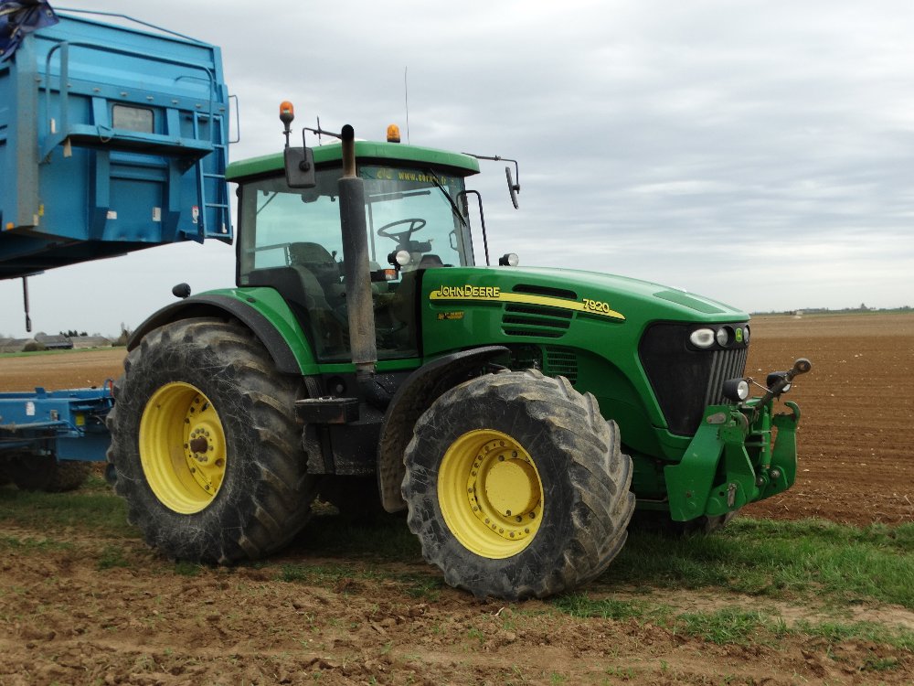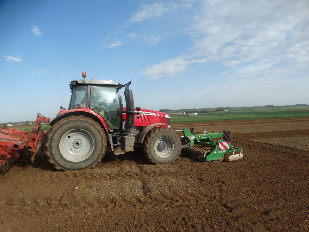 On retrouve un Merlo, un John Deere 7920 et une tridem Maupu semi-élévatrice, Claas Arion 650 et herse frontale et Grimme GB 430