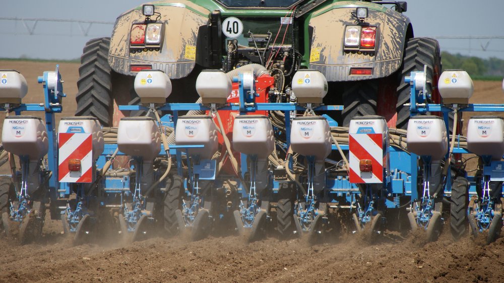 #211Semis de tournesols dans le Pithiverais avec un Renault 110-54 et un Monosem 12 rangs