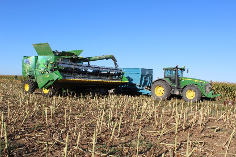 Pour ce faire, moisson de tournesols en full John Deere. Au programme, une S760 accompagnée aux bennes d'un 8430 et d'un 8245R <ok>