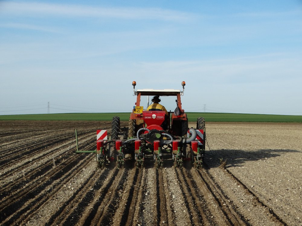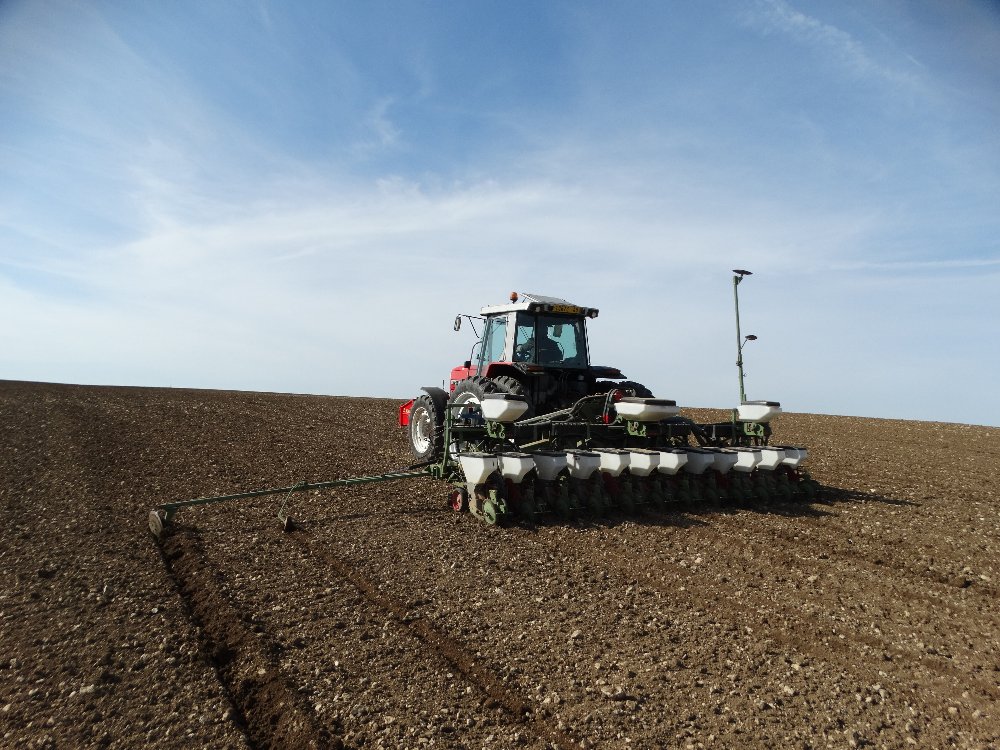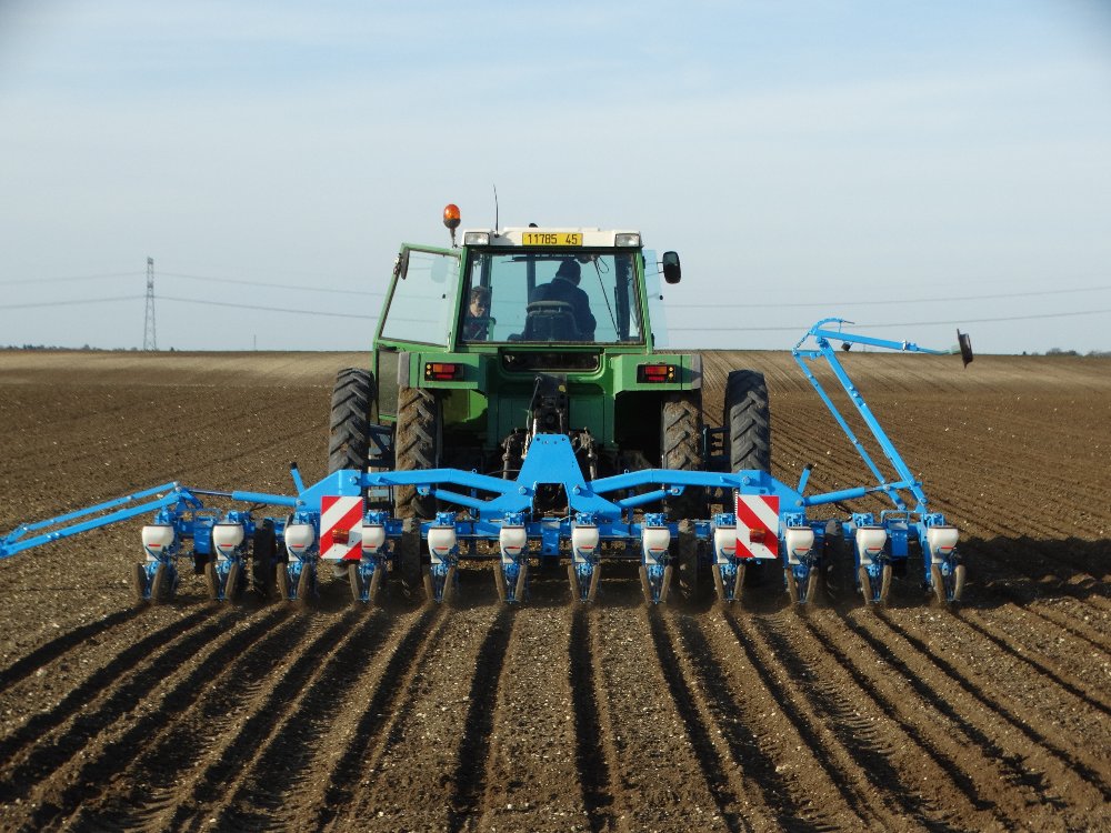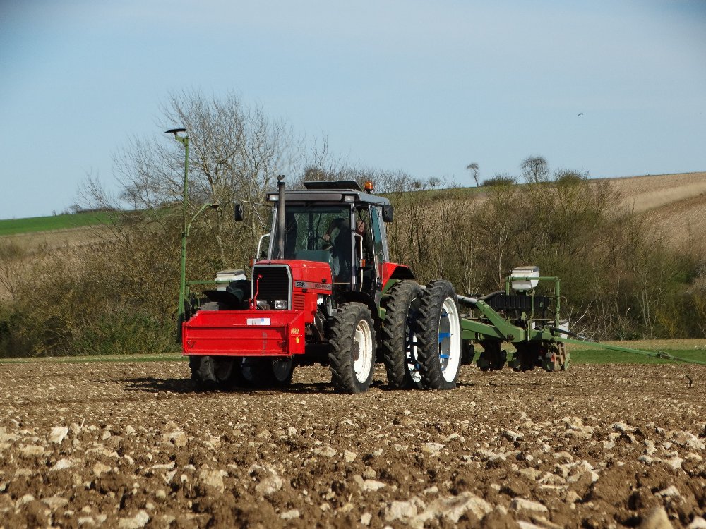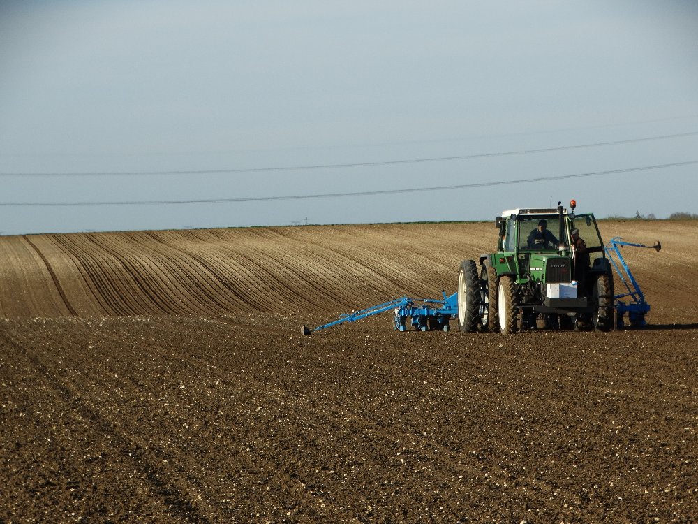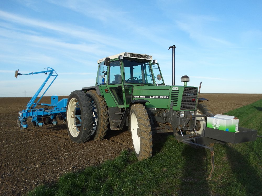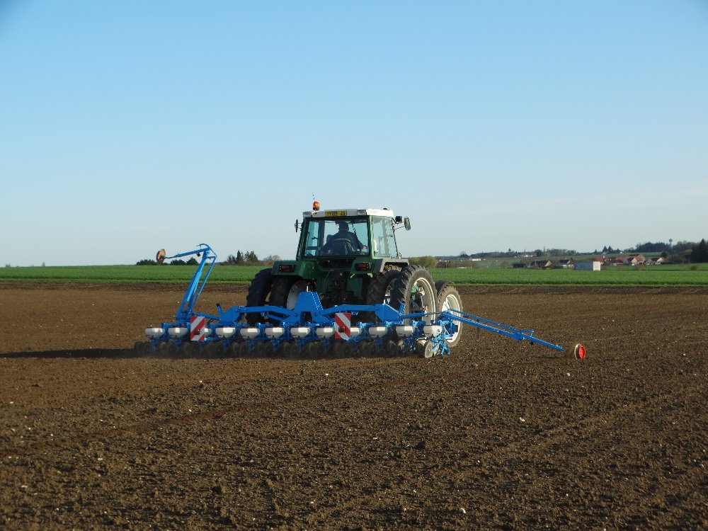 Avant la pluie, semis avec un Fendt Farmer 312 LSA. Ayant commencé sur une effeuilleuse/arracheuse, il continu son bout de chemin à 13000h aux semis avec un Monosem 12 rangs.