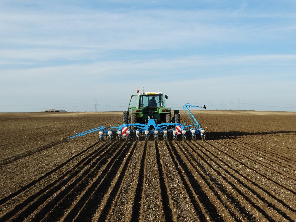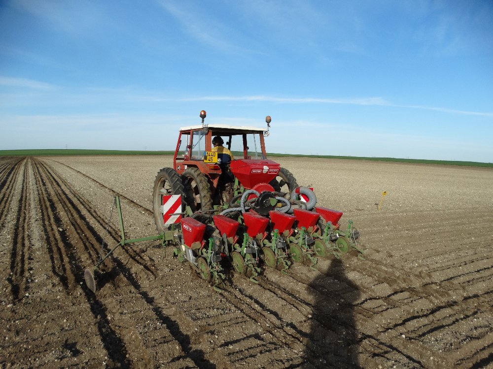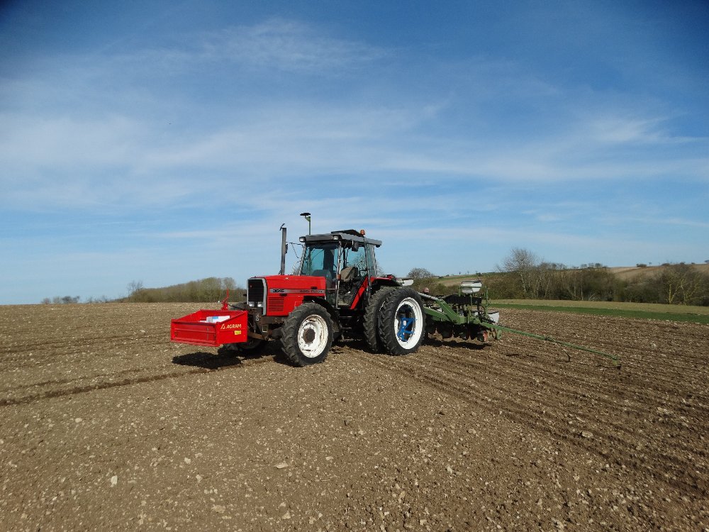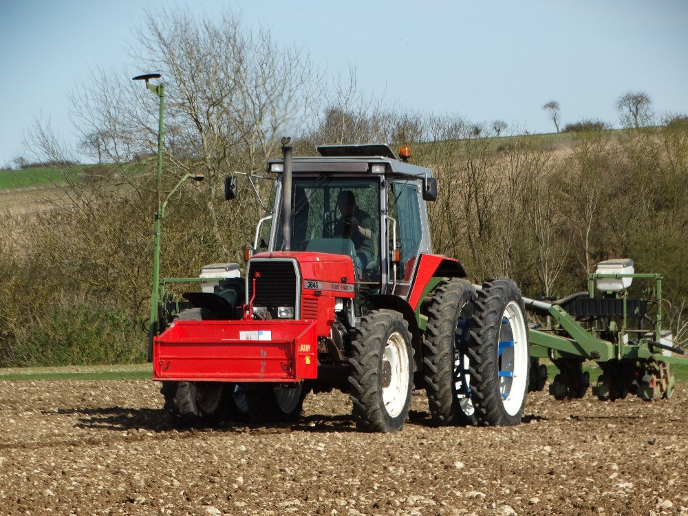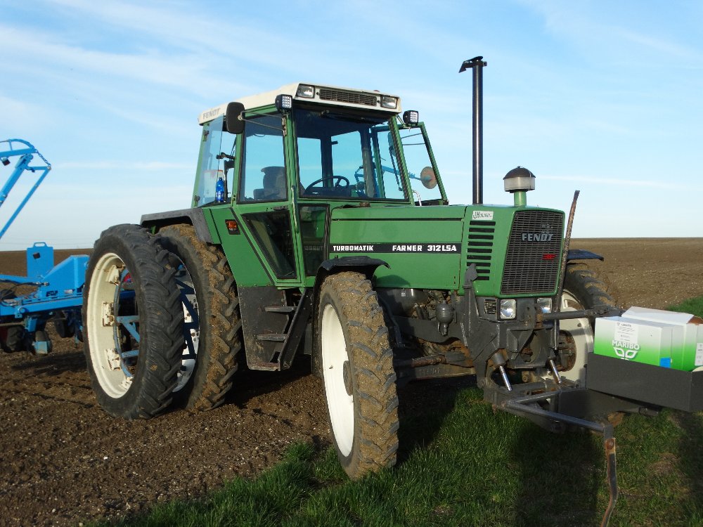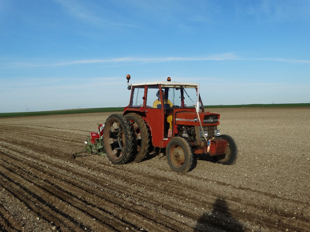 Avant la pluie, semis avec un Fendt Farmer 312 LSA. Ayant commencé sur une effeuilleuse/arracheuse, il continu son bout de chemin à 13000h aux semis avec un Monosem 12 rangs.