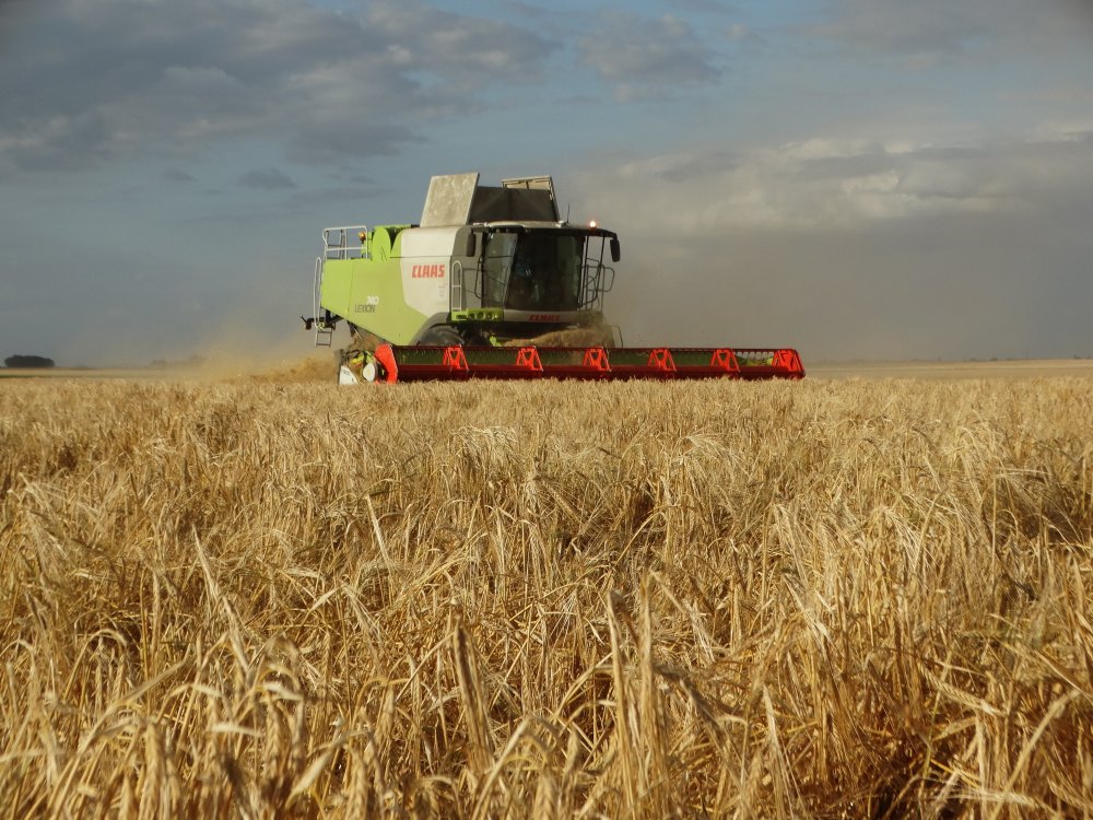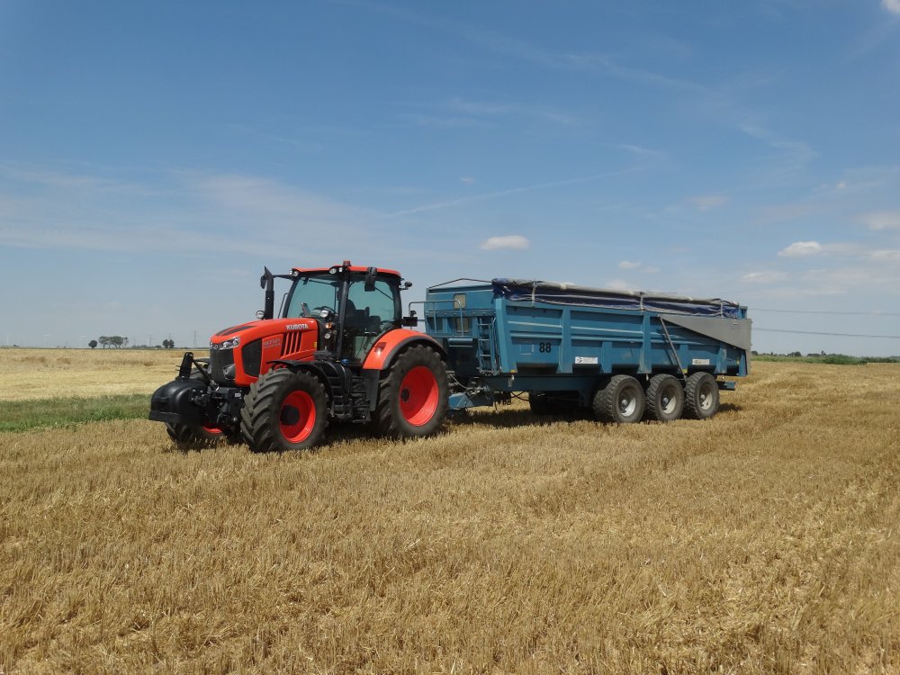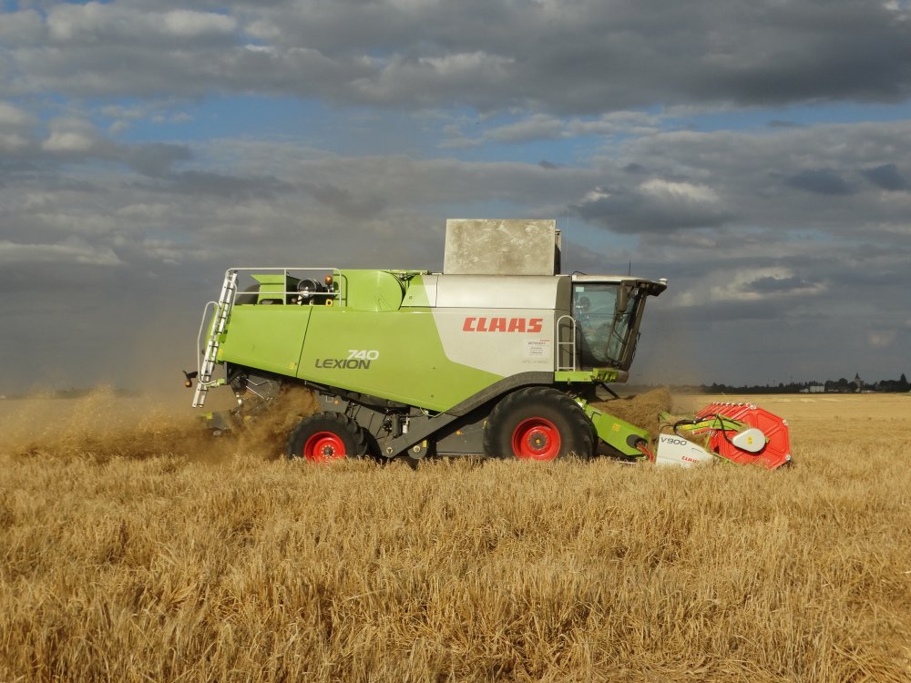 On retrouve une Claas Lexion 760 en 9m30 et aux benne un kubota M7171 et une Maupu 3 essieux ainsi qu'un John Deere 7920 et une Maupu 2 essieux