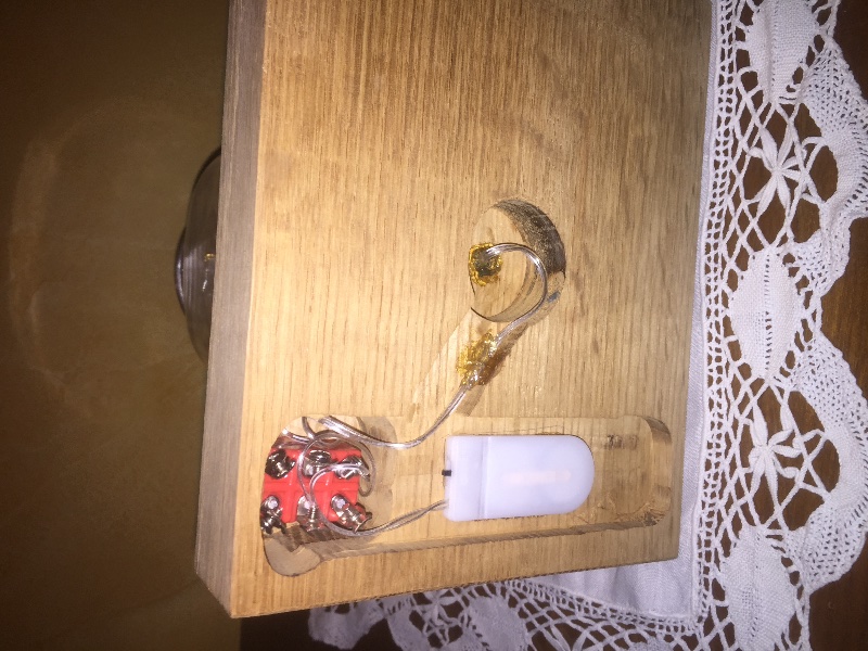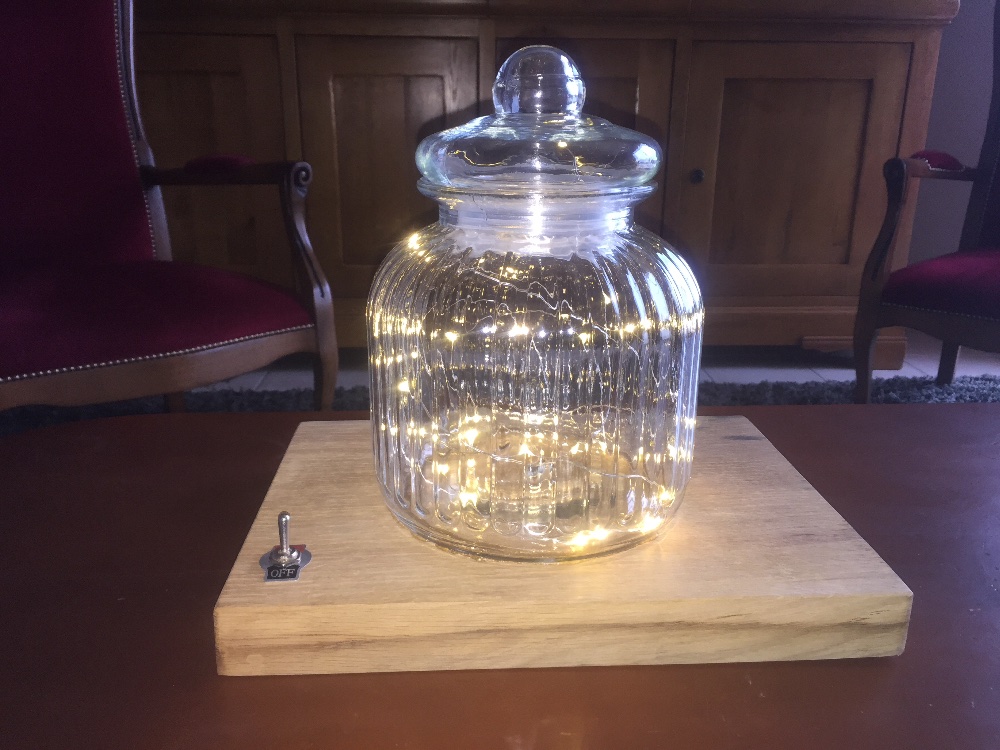 #56Bonjour pour commencer tu prends du scotch épais tu le Colles à l'intérieur et à l'extérieur du bocal tu traces le centre un forêt au carbure de 6 mm de l'eau pour éviter que ça chauffe percer lentement vitesse rotation mini appuyer doucement après une planche de chêne un emplacement pour le bouton et la batteriefab22 a écrit : ↑mer. 21 mars 2018 23:23Excellent, bon delire original bien efficace !