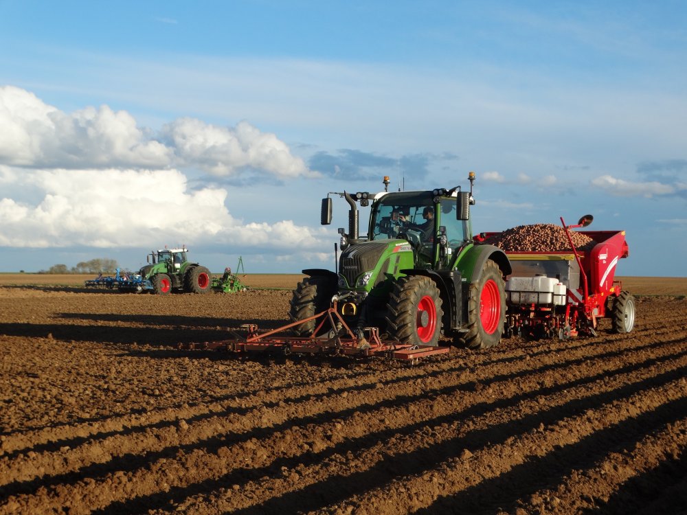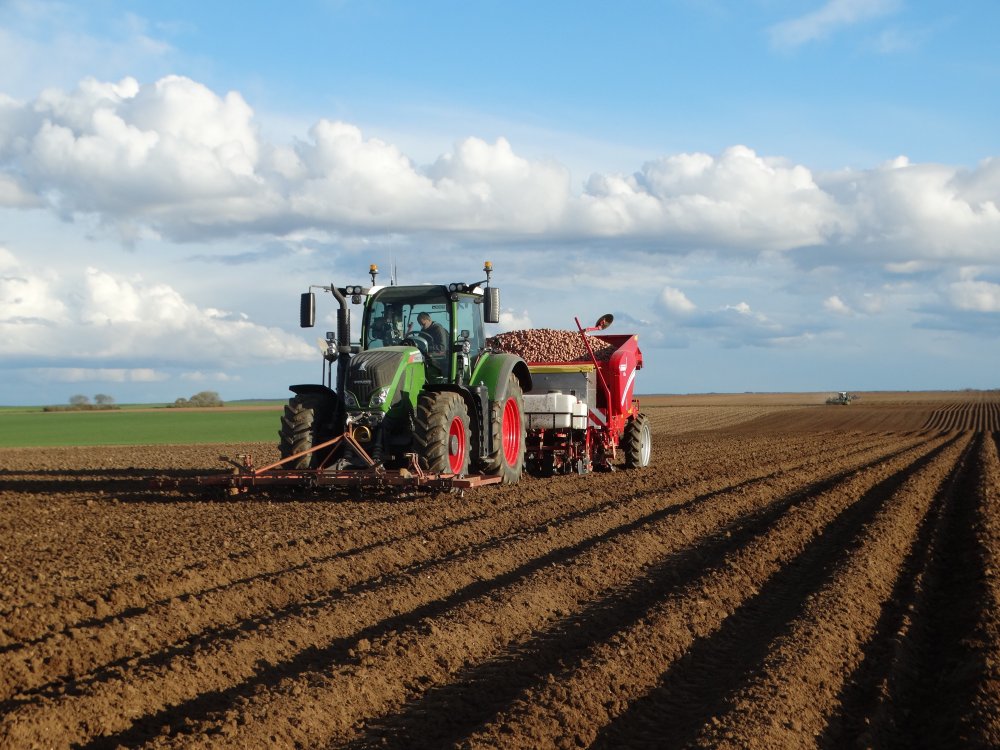 Fendt 716 avec sa petiteherse à l'AV et sa planteuse Grimme GB430
