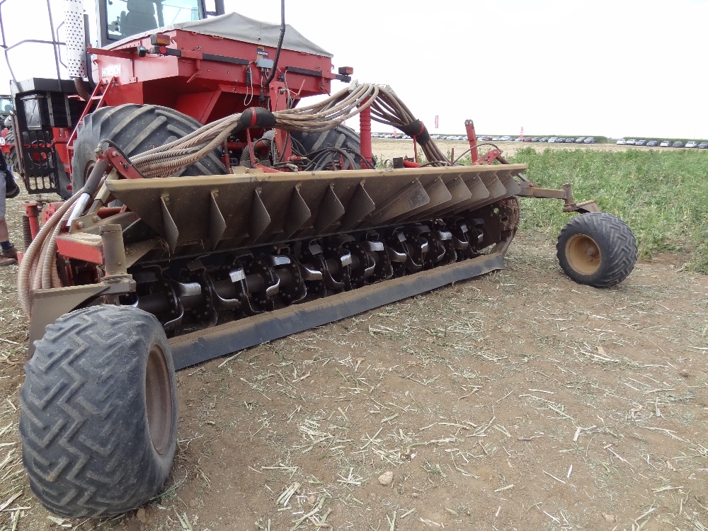 Une rampe dépose les graines au sol sur toute la largeur du semoir et un rotor à axe horizontal projette la terre à l'arrière du semoir pour recouvrir les graines.