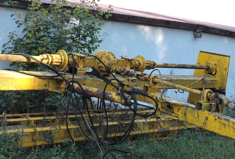 Il semble y avoir un pont avant de tracteur en guise de renvoi d'angle, les arbres partent de chaque côté et transmettent le mouvement au rouleau (monocle) .