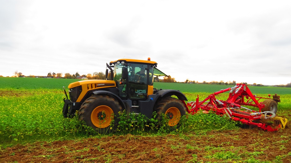 Côté utilisation aux champs, le comportement est assez surprenant: bon équilibre et bonne adhérence sans forcer le lestage sur le relevage avant (sur la seconde photo, il s'agissait d'une utilisation avec un DDI en destruction de couverts sur sol mouillé et pourtant les crampons restent propres).