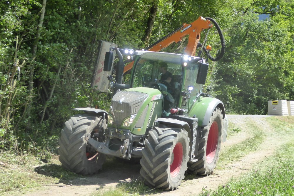 Bonjour. Cet après-midi, autour du lac d'ANNECY, opération taille de haies à la demande d'un client privé. Pour cela, voici un FENDT 718 VARIO avec épareuse NOREMAT MAGISTRA.