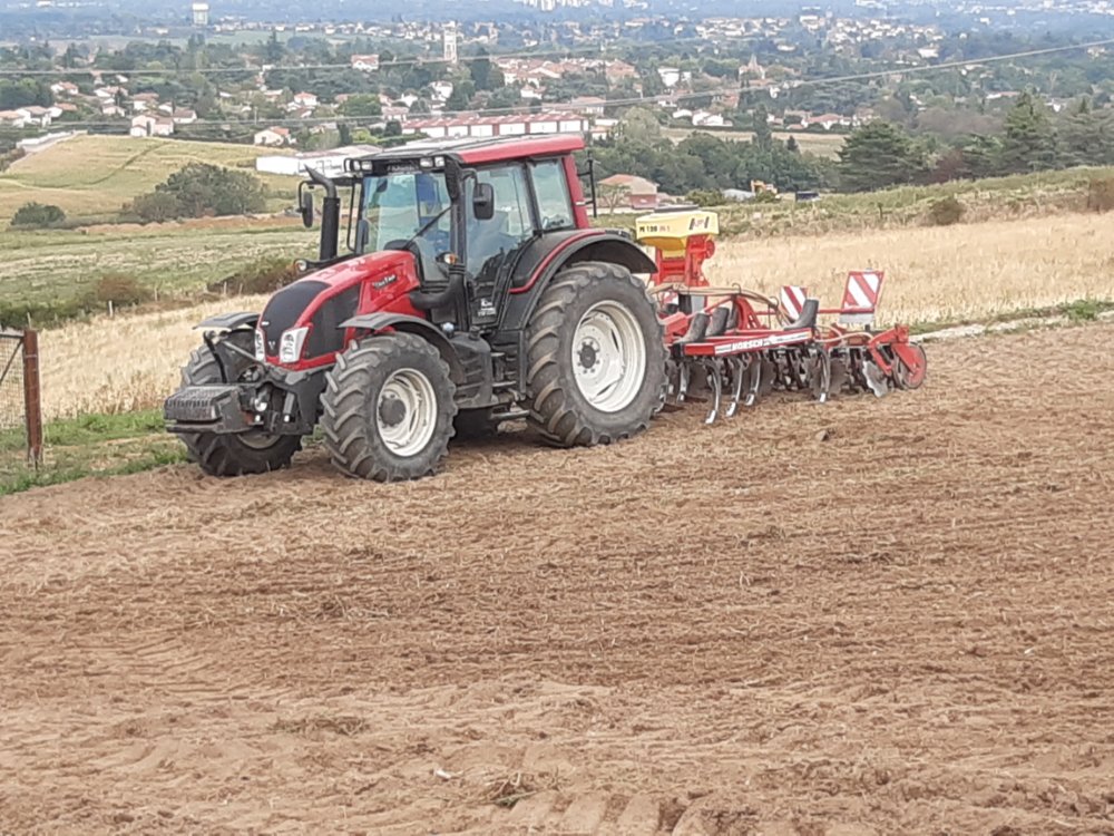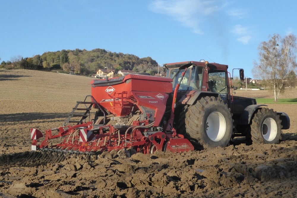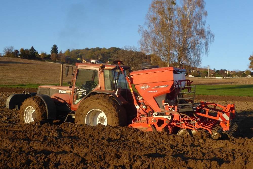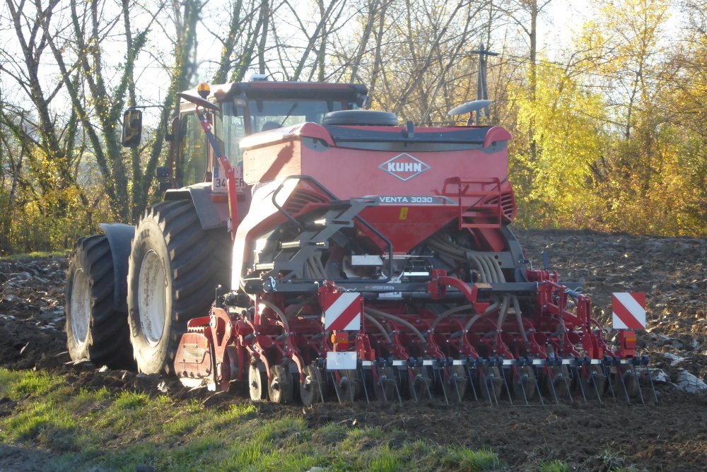Bonjour. Hier, par un bel après-midi d'automne et un terrain assez gras par endroit. Semis d'orge avec un combiné herse KUHN HR et semoir VENTA 3030, attelé à un FIATAGRI WINNER F 130, mis à rude épreuve.