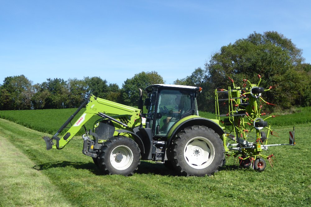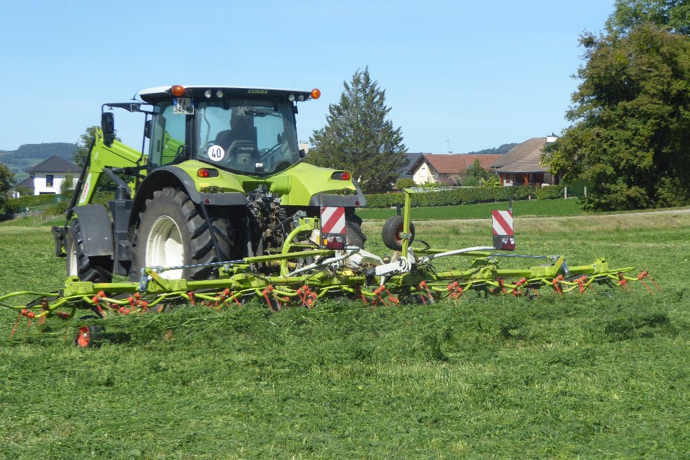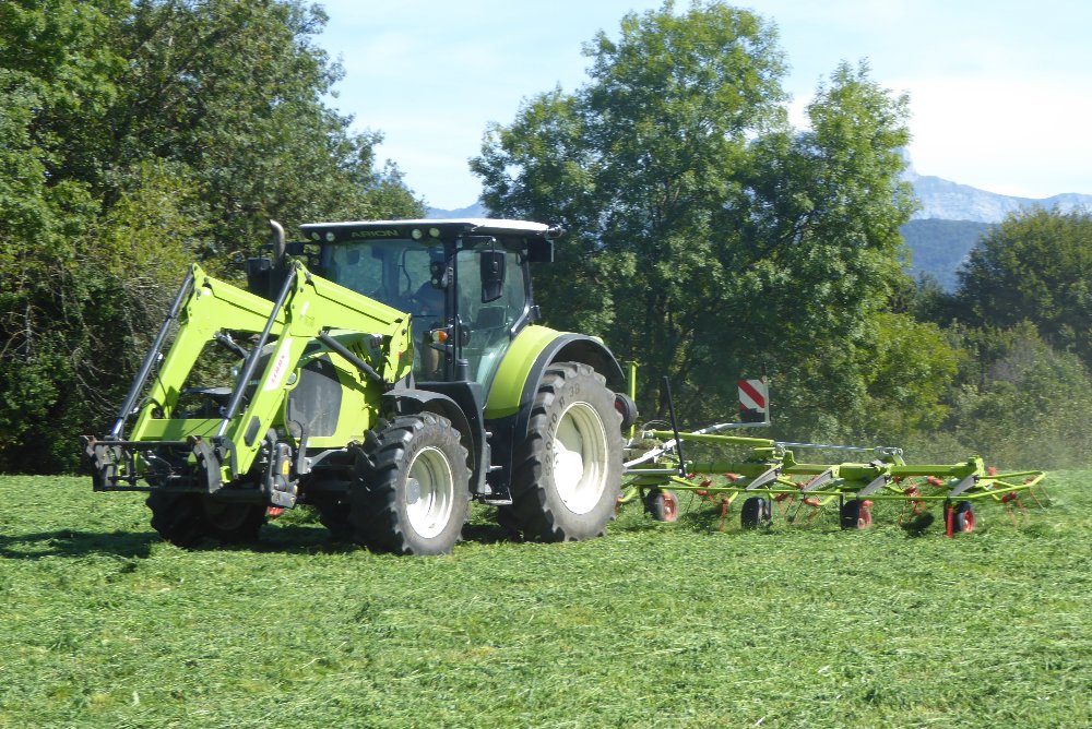 #10Bonjour. C'est la quatrième coupe de luzerne, et certainement la dernière sortie de l'année pour cette faneuse CLAAS VOLTO 900, entrainée par un ARION 510.