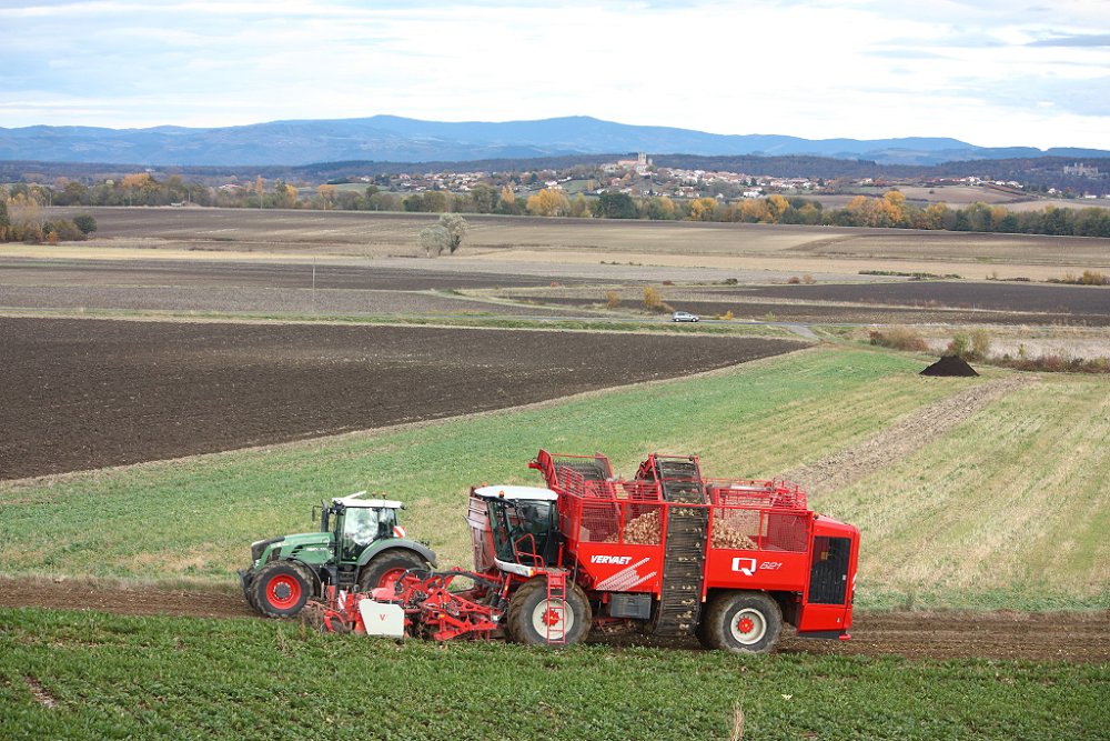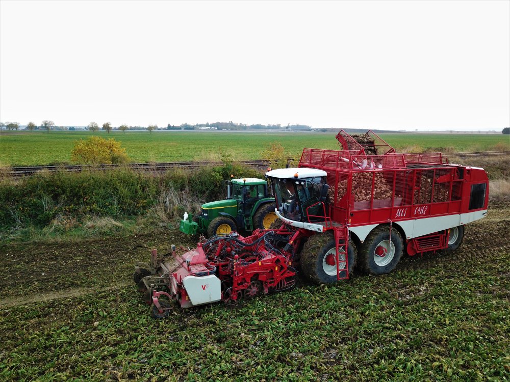 Arrachage de betterave en Limagne avec une Vervaet Beet Eater 625 avec bâti à roues Oppel et télé-gonflage. Au débardage on retrouve un John Deere 6810 et une benne Maitre Atena 24.10