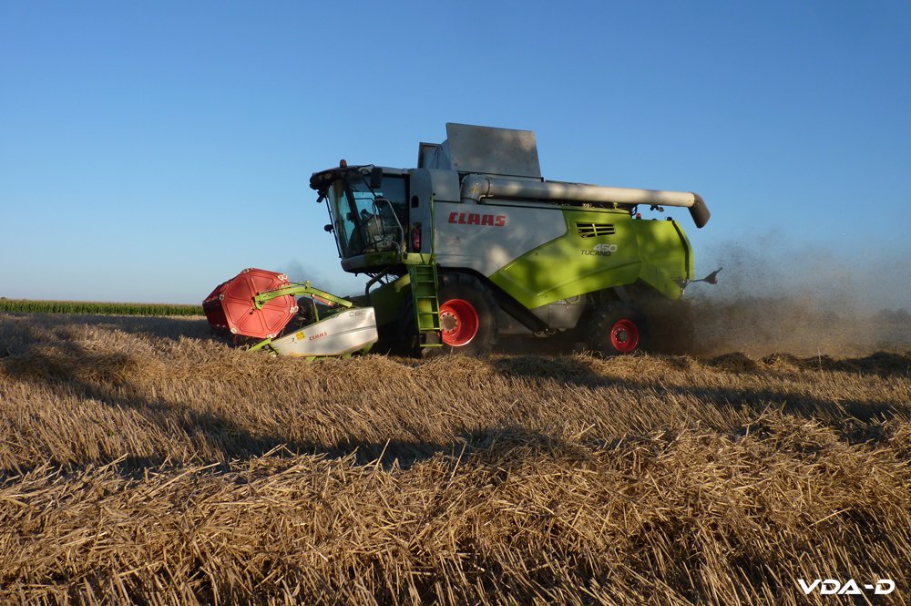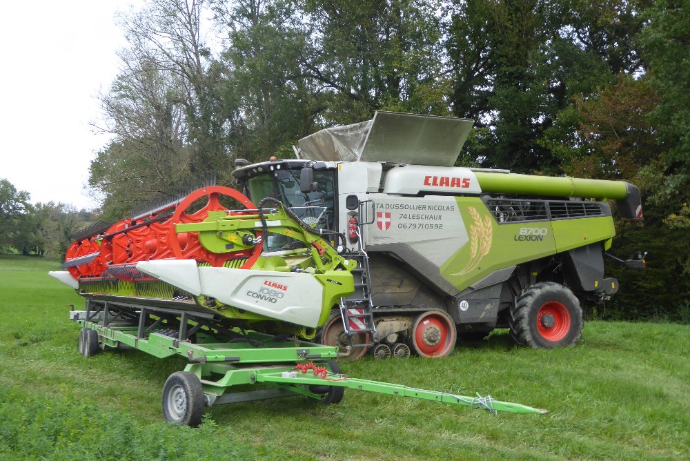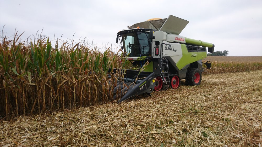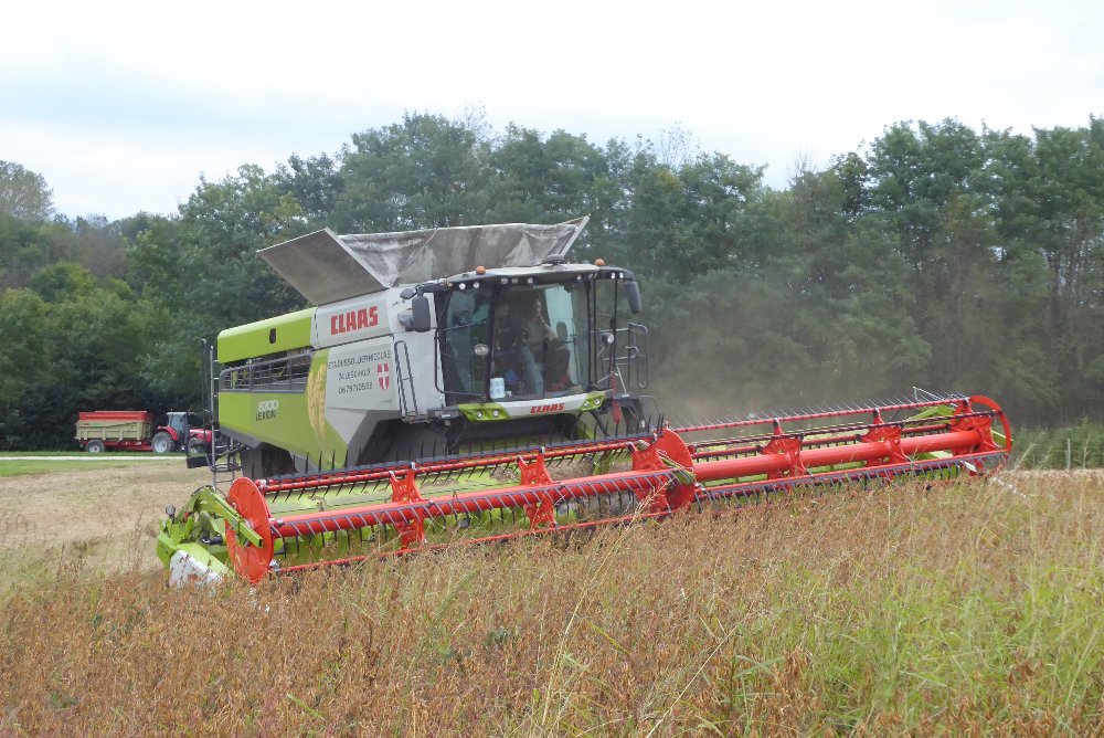 Bonsoir. Aujourd'hui, je suis tombé sur la moisson du soja. Pour ce faire, une CLAAS LEXION 8700 TERRATRAC avec coupe Convio 1080 était à l'oeuvre. 10,80 m de largeur de coupe, cela fait très large par ici.