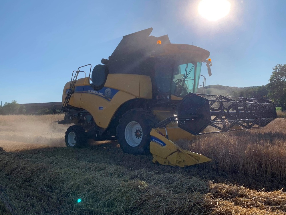 Début des moissons timidement hier après-midi dans le secteur de Bure, IH 7230 et deux 1455 se sont occupés du transport tandis qu'une des 3 batteuses (IH 2388) de l'exploitation battait