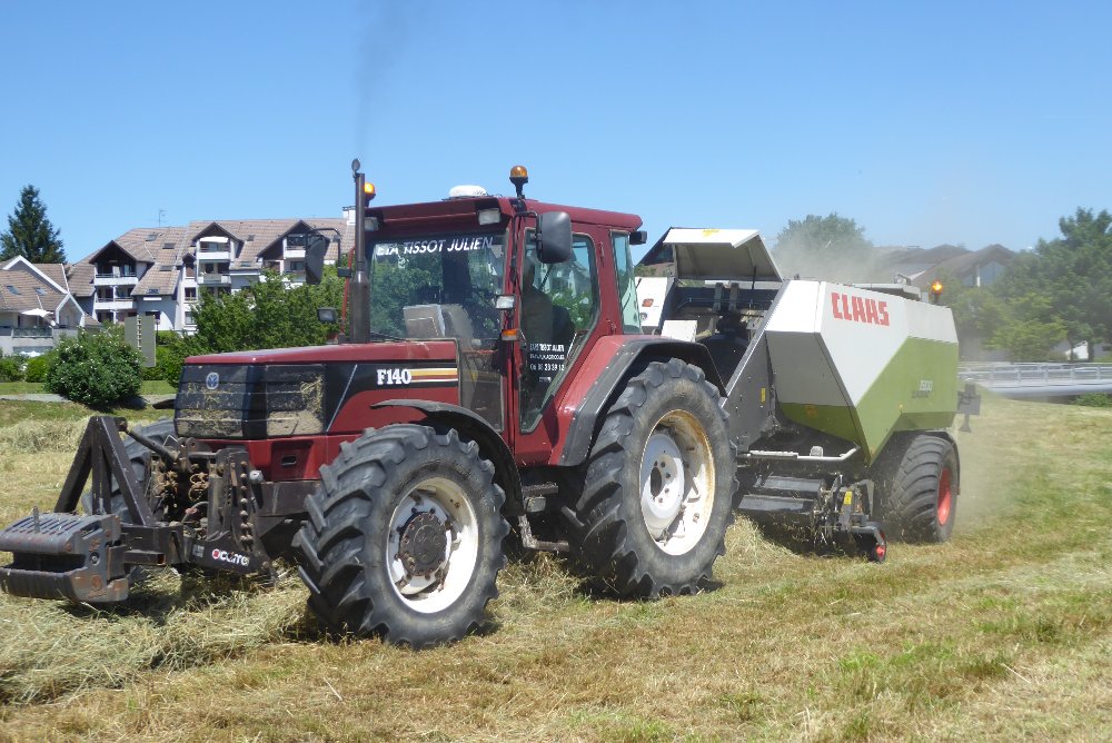 #36Bonjour. Sur les hauteurs d'Annecy, revoilà le FIATAGRI WINNER F 140 ( il est increvable ce tracteur ) au pressage avec une CLAAS QUADRANT 2200. Ronflement du tracteur, presse à l'appétit sans limite, mais qui a bourrée en allant trop vite ( ça peut arriver... ) . Rien de grave puisque en moins de 4 à 5 minutes, le pressage reprenait de plus belle.