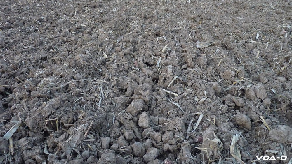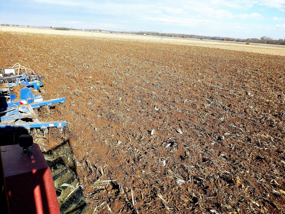 > Le Tiger 4 MT de chez HORSCH (20 disques / 9 dents) sur des chaumes de maïs broyés.