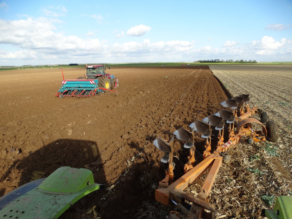 Semis de blé après maïs avec un NH T7.250 et son semoir köckerling allseeder de 6m précédé au déchaumage d'un NH T8.410 et son terrano 6 FM: