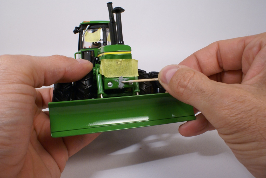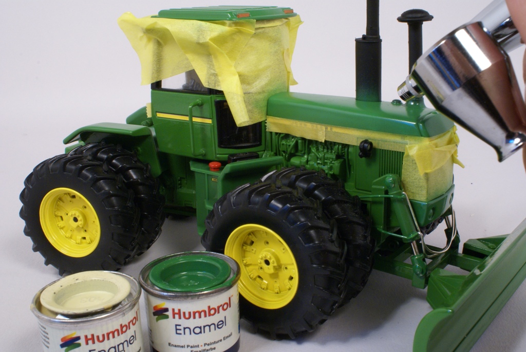 Le premier travail consiste à mettre en place de la bande masque autocollante pour protéger la peinture du tracteur. Cette bande masque est aussi mise en place sur la zone de balayage des essuies glaces. Puis, pour faire disparaître le joint disgracieux présent à l’avant et à l’arrière du tracteur, on utilise du mastic en tube pour modélisme (Italéri, Tamiya, etc.). Le mastic est mis dans les joints, puis lissé avec un cure dent. Le mastic est poncé une fois sec, avec du papier de verre pour carrosserie, puis avec de la laine d’acier n°0000. Les durites des vérins de la lame sont reproduites avec de la tige en acier, puis collées avec de la colle cyanoacrylate. Le tracteur est protégé avec de la bande masque pour la mise en peinture des parties mastiquées ainsi que du capot et du toit de cabine. Les surfaces horizontales d’un véhicule sont souvent plus exposées aux rayons du soleil et de la lune. Elles sont donc repeintes avec un mélange de peinture brillante et mate dans une proportion de 10% de beige clair (Humbrol 103) mat pour 90% de vert brillant (Humbrol 32). Les phares du tracteur sont remplacés par des lentilles pour modélisme automobile. Les lentilles utilisée sont de la marque Renaissance, elles existent en différents diamètres de 2,5mm à 5mm, il en existe également de forme rectangulaires. On protège ensuite la peinture avec une couche de vernis mat ou satiné. Ce verni permet également une meilleure accroche des pigments en poudre appliqués par la suite.