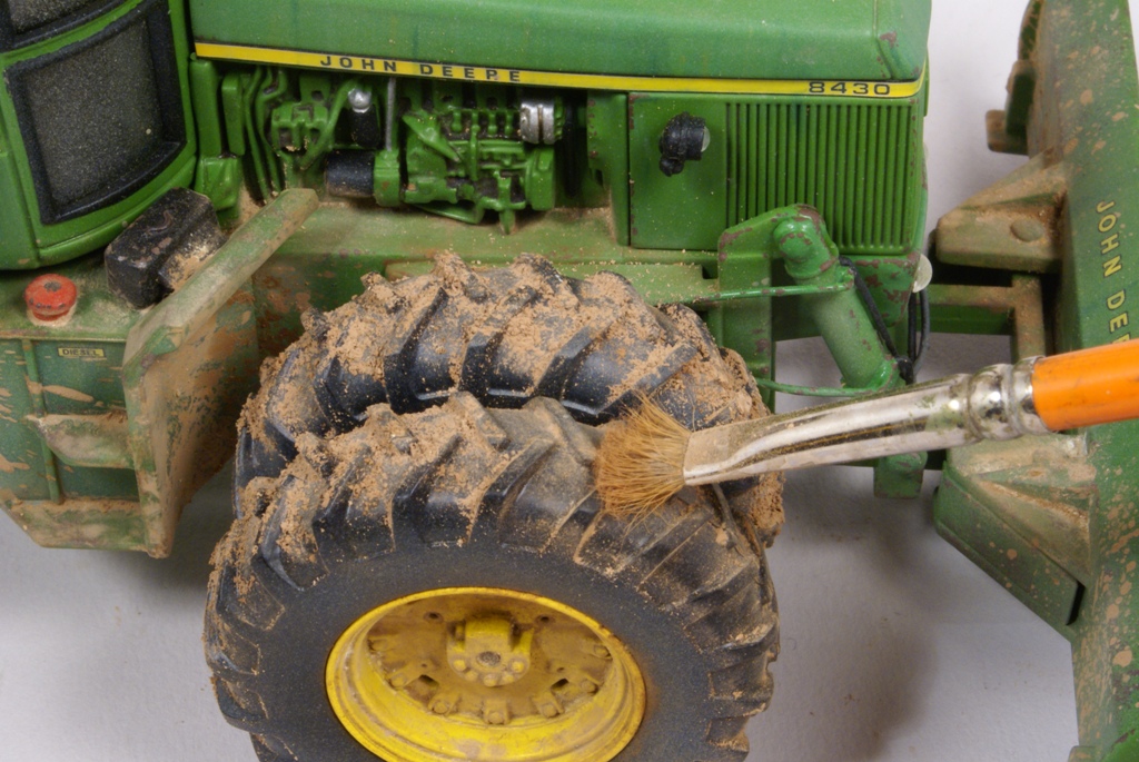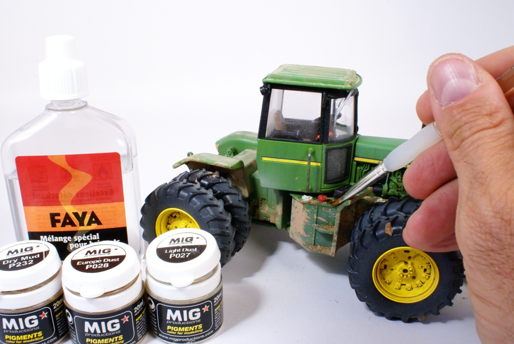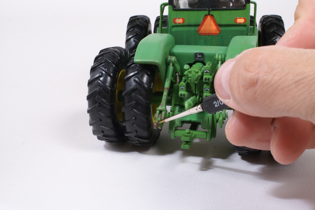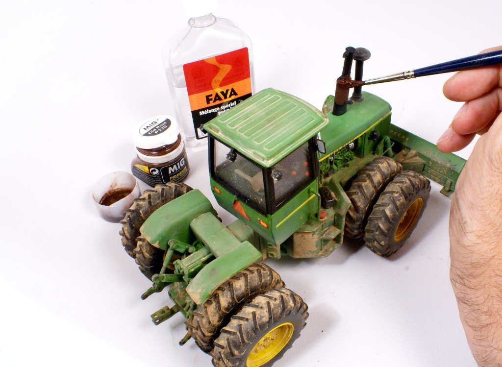 Une fois le verni bien sec (24 heures) et de façon à apporter plus de profondeur à la peinture, ainsi que de souligner les lignes de structure du tracteur, on applique un jus réalisé avec un mélange d’essence F (essence à briquet) et de peinture à l’huile pour artistes de couleur terre d’ombre naturelle. La dilution doit être d’environ 90% d’essence pour 10% de peinture. L’opération sera répétée si nécessaire, jusqu'à obtention de l’effet désiré. La lame avant est préparée en vue de la patine en appliquant un voile de peinture mate acrylique brun rouge (XF 52 Tamiya). Cette peinture est diluée à 50% d’alcool à brûler pour la rendre plus fluide. Pour commencer la patine proprement dite, on applique la méthode dite du « weathering ». Cette méthode est destinée à reproduire les effets de la pluie sur la poussière et la peinture. Pour se faire, on dispose de petites touches de peinture à l’huile pour artistes de différentes couleurs : blanc, ocre jaune, terre d’ombre naturelle et bleue. Pour un tracteur vert on utilise du bleu, pour toutes les autres couleurs de carrosserie, on utilisera du vert.