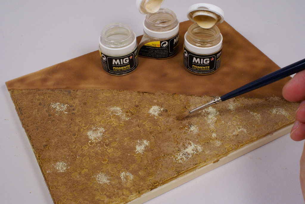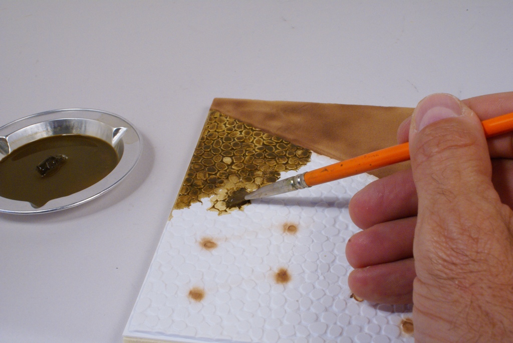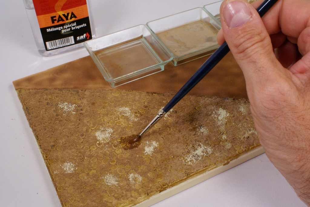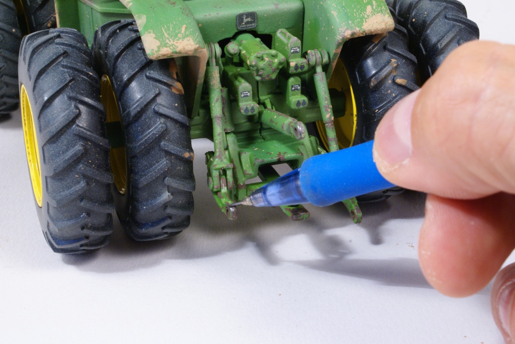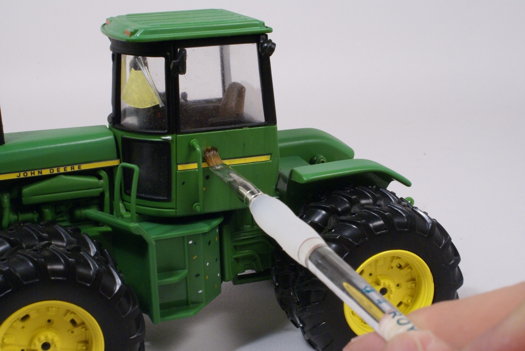Une fois le verni bien sec (24 heures) et de façon à apporter plus de profondeur à la peinture, ainsi que de souligner les lignes de structure du tracteur, on applique un jus réalisé avec un mélange d’essence F (essence à briquet) et de peinture à l’huile pour artistes de couleur terre d’ombre naturelle. La dilution doit être d’environ 90% d’essence pour 10% de peinture. L’opération sera répétée si nécessaire, jusqu'à obtention de l’effet désiré. La lame avant est préparée en vue de la patine en appliquant un voile de peinture mate acrylique brun rouge (XF 52 Tamiya). Cette peinture est diluée à 50% d’alcool à brûler pour la rendre plus fluide. Pour commencer la patine proprement dite, on applique la méthode dite du « weathering ». Cette méthode est destinée à reproduire les effets de la pluie sur la poussière et la peinture. Pour se faire, on dispose de petites touches de peinture à l’huile pour artistes de différentes couleurs : blanc, ocre jaune, terre d’ombre naturelle et bleue. Pour un tracteur vert on utilise du bleu, pour toutes les autres couleurs de carrosserie, on utilisera du vert.