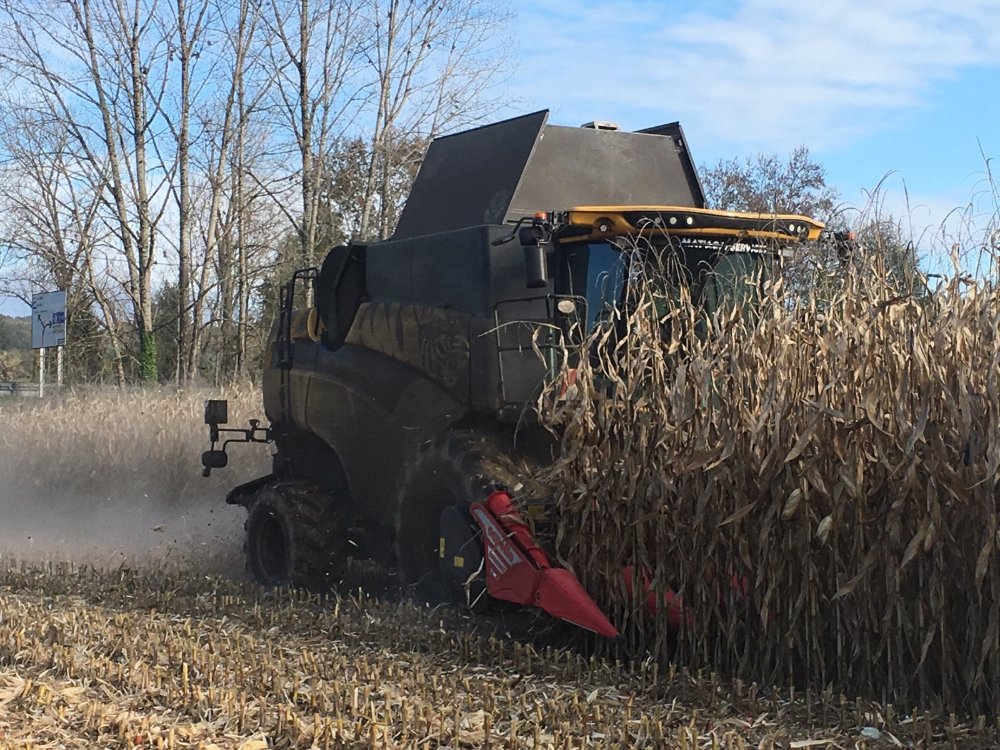 New Holland TF 78 ,avec cueilleur Geringhoff ,rota disc 8 rangs , des cousins , au maïs grain , avec un des Valtra , le t 214, et sa Knapick legrand ,18 tonnes au transport