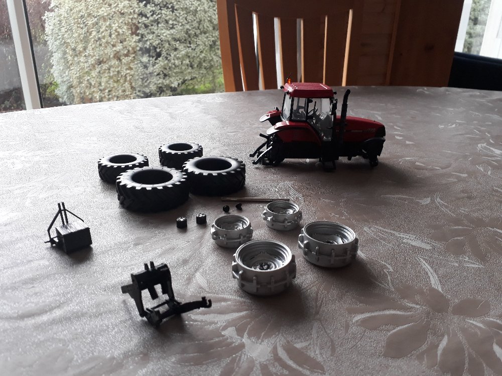 -Changement des roues jumelées pour des roues simples, jante du Valtra série T repeinte en gris Alu et noir pour les moyeux et pneus d'origine pris sur le jumelage.