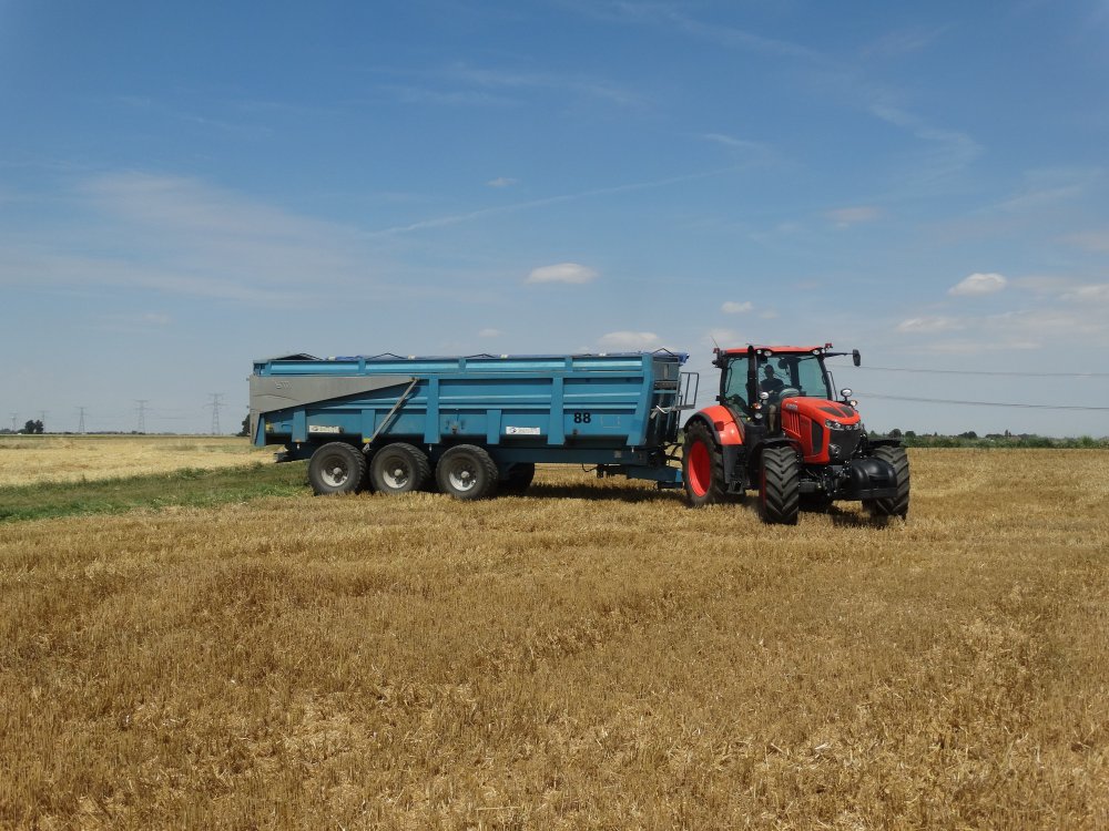 On retrouve une Claas Lexion 760 en 9m30 et aux benne un kubota M7171 et une Maupu 3 essieux ainsi qu'un John Deere 7920 et une Maupu 2 essieux