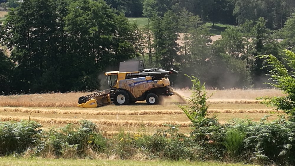 Bonjour. Aujourd'hui par un temps bien nuageux, la moisson bat son plein à quelques kilomètres d'Annecy. Une NEW-HOLLAND CSX 8050 à l'oeuvre dans de l'orge un peu versé , après la tempete de la semaine dernière. Un DX 3.65 avec une MAITRE aux ridelles maison attend la récolte.