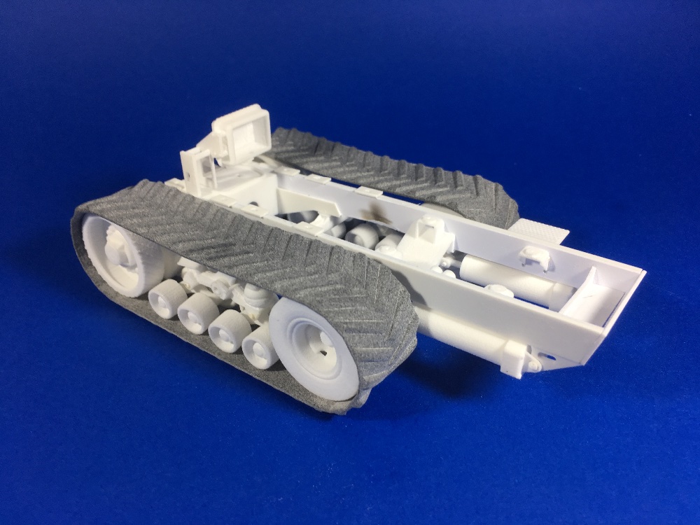 Quand bien même je me serai attelé au ponçage des crampons pour en diminuer la hauteur, la tension des chenilles ne correspond pas à un modèle ayant travaillé quelque (s) millier (s) d'heures ... Pour en avoir photographié un certain nombre de Challenger, impossible de monter un 65 avec les chenilles d'origine pour coller avec une réalité technique ...
