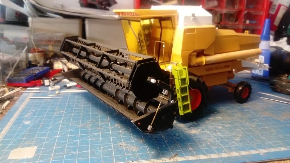 Au programme, rehaussage de la trémie, avec panneaux ouvrants, confection d'un broyeur, barre de coupe modifiée, nouveaux capots, rabatteurs réglables en hauteur etc.....