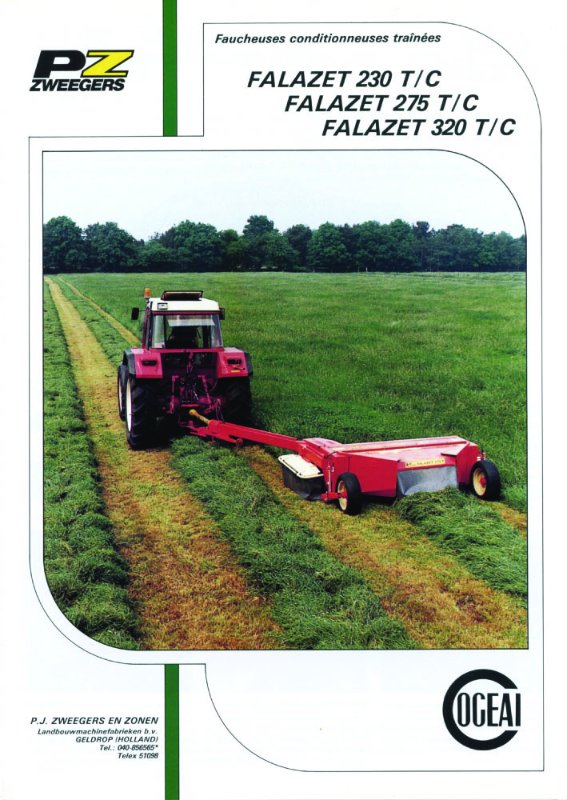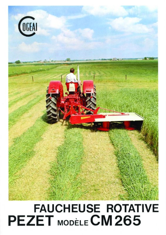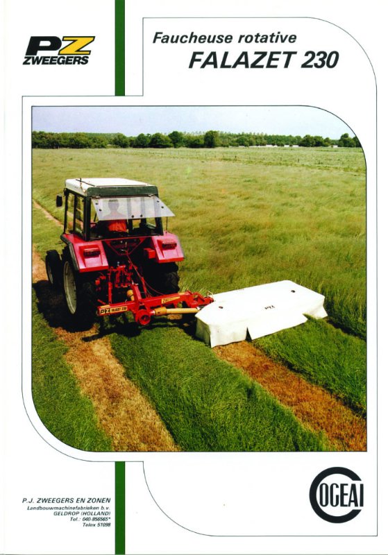 La société Zweegers est apparue en France avec le lancement par la Sté Cogeai de la toute première faucheuse rotative au SIMA de 1965. Ce type de machine a révolutionné la récolte du fourrage et à très vite été copié par la plupart des constructeur (y compris dans sa forme à disques). Aujourd'hui il n'y a pratiquement plus d'autre type de matériel pour couper l'herbe. Avant la PEZET CM4, première machine de ce type commercialisée, un prototype avait vu le jour en 1964, c'est lui qui est à l'origine de toutes les machines actuelles (voir photo). Un autre prototype la CMF220 est né peu après et donnera naissance à toutes les faucheuses frontales. Il ne sera pas commercialisé car trop complexe à adapter au tracteur et l'invention de la prise de force frontale devait simplifier cette adaptation. Elle donnera néanmoins naissance à la gamme CM215.