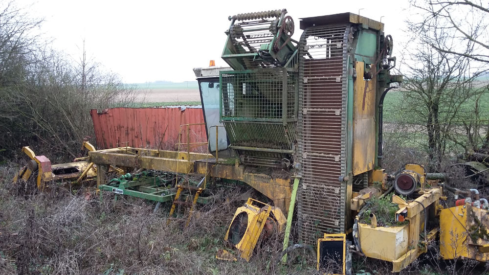 Voici une machine assez rare malheureusement laissée à l'abandon. Il s'agit d'une arracheuse à betteraves Sopema SF210 datant du milieu des années 80. Cette machine fut réalisée avec des composants Franquet (bâti arracheur et élévateur).