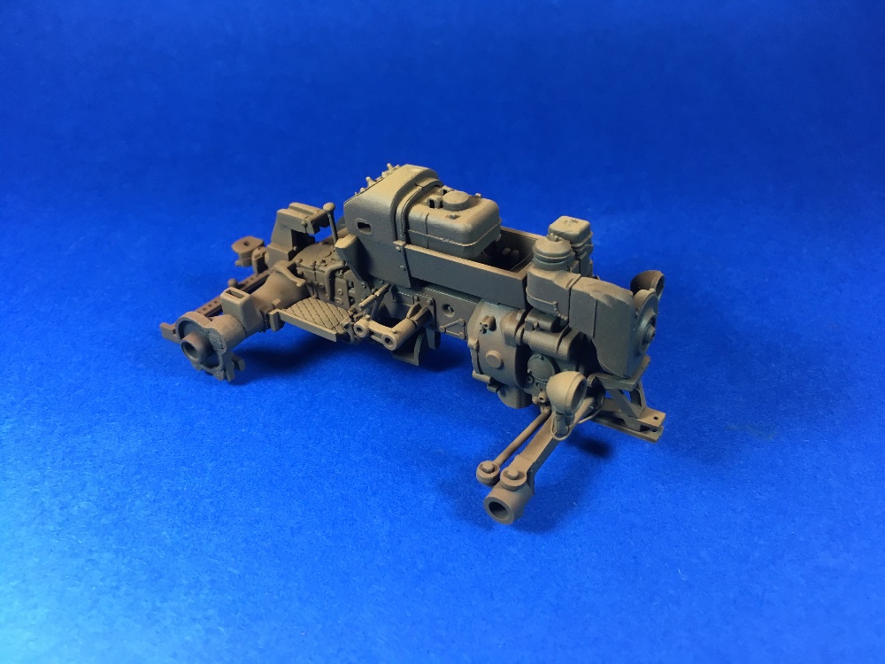Ainsi préparé, l'ensemble des pièces reçoit une couche de peinture gris panzer et immédiatement, l'uniformisation de la teinte enlève le côté translucide et teinté dans la masse de certaines pièces. On gagne très vite en profondeur et en unité.