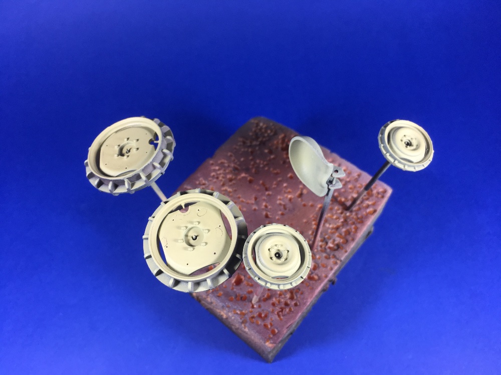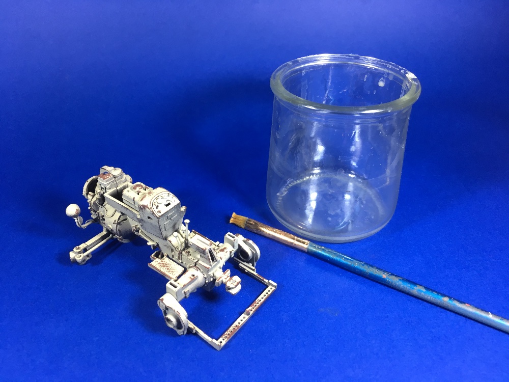 L'apprêt gris foncé étant sec, et que l'on a recours à la technique de la laque à cheveux, on appliquera une couche de produit "chipping" sur l'ensemble des pièces à l'aérographe.